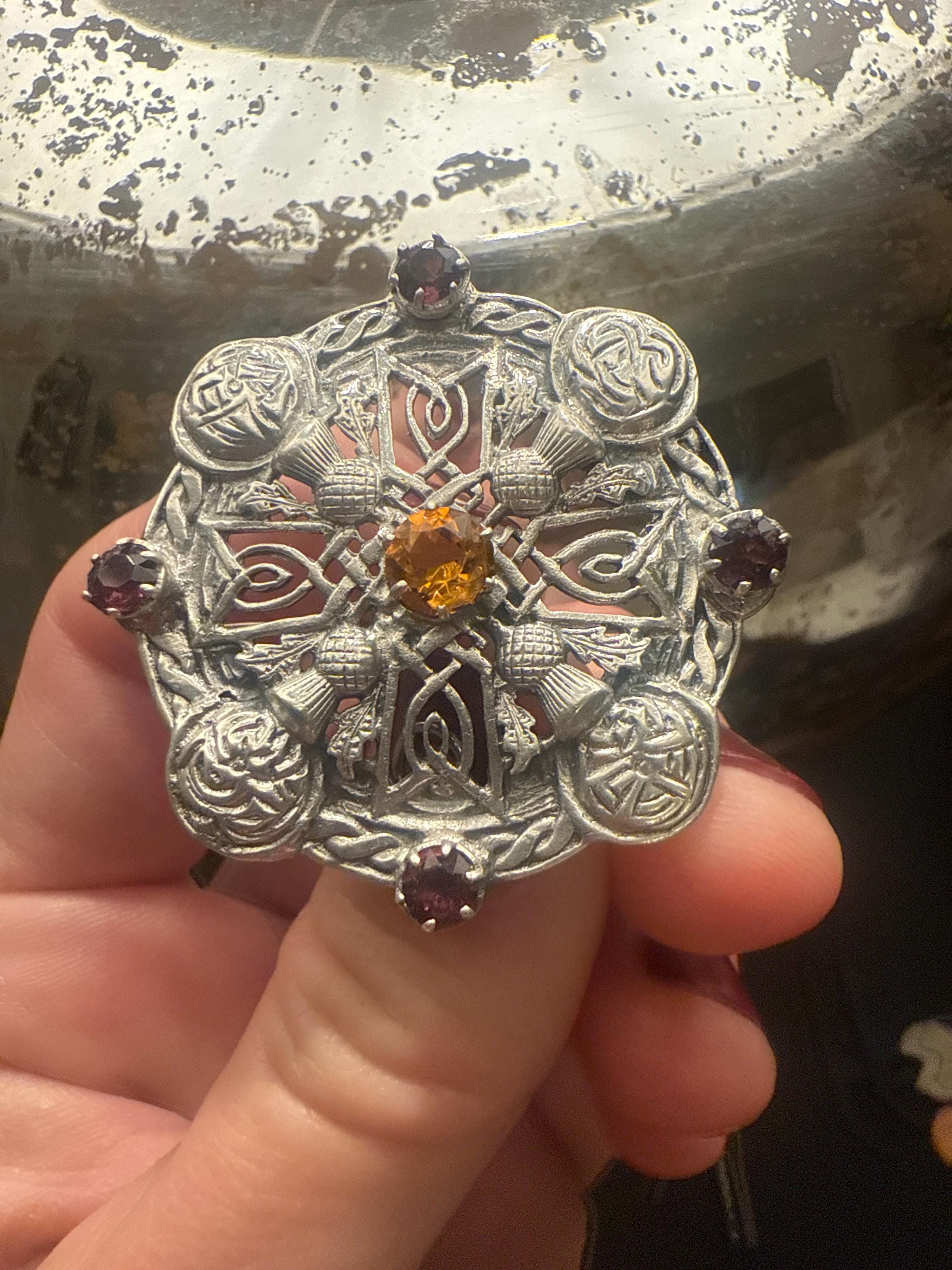 in good used condition. Attractive silver celtic knot and thistle design brooch set with amethyst and citrine colour paste stones.