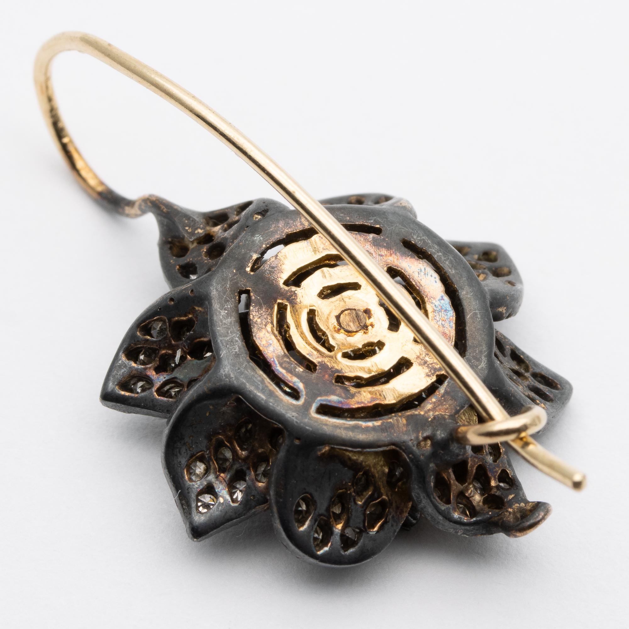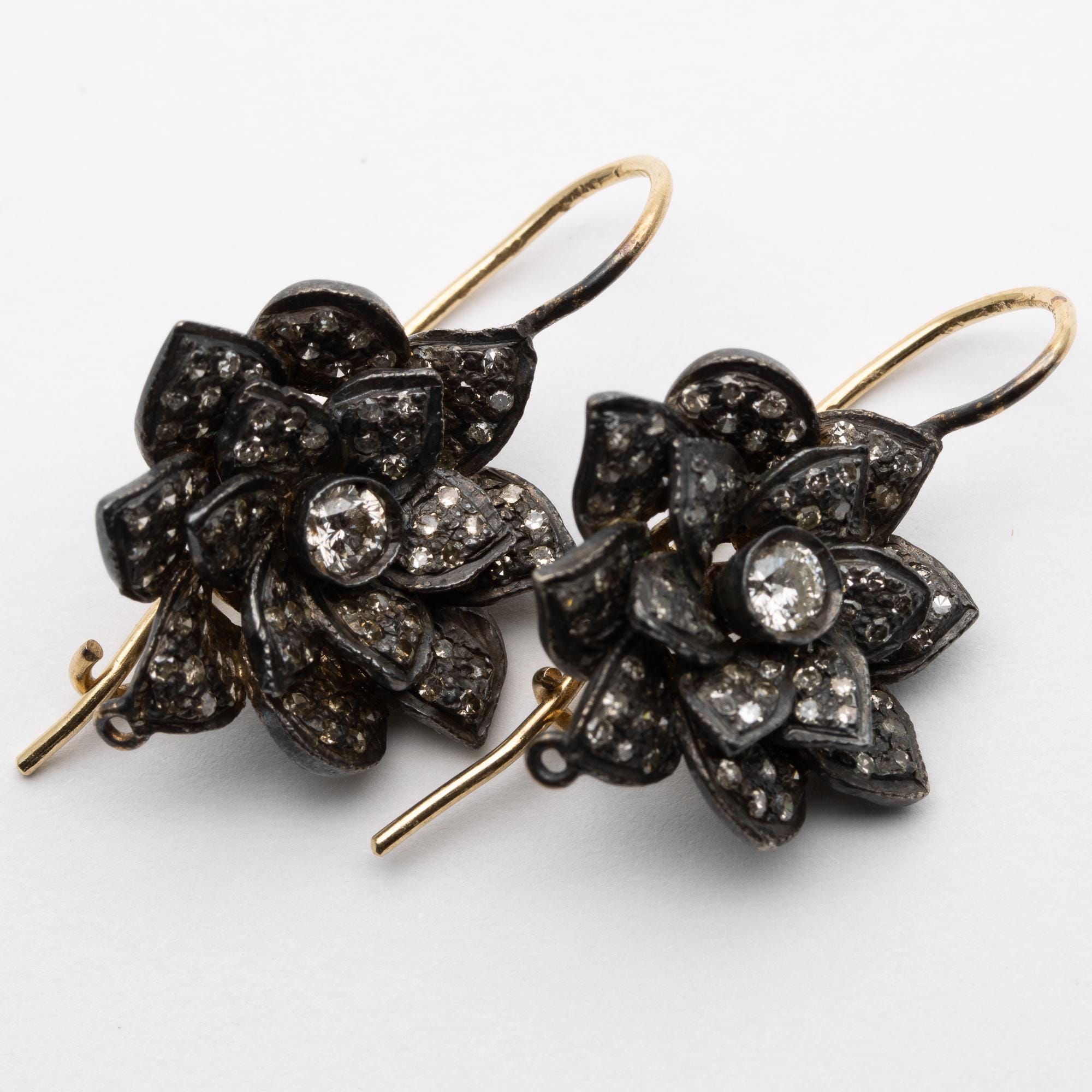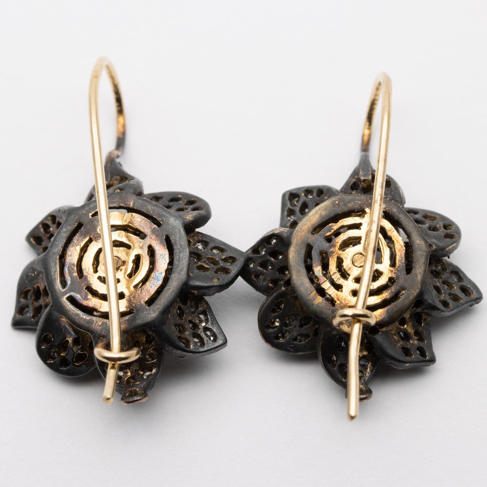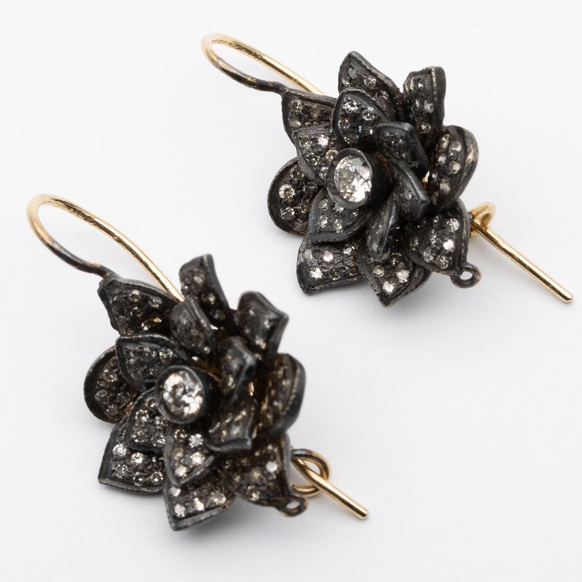 in good used condition. Really unusual blackened 18ct gold earrings set with approx. 70 x 1-1.5mm diamonds in each plus a central 3mm diamond. Believed to have been converted to hooks, missing a drop from the bottom.