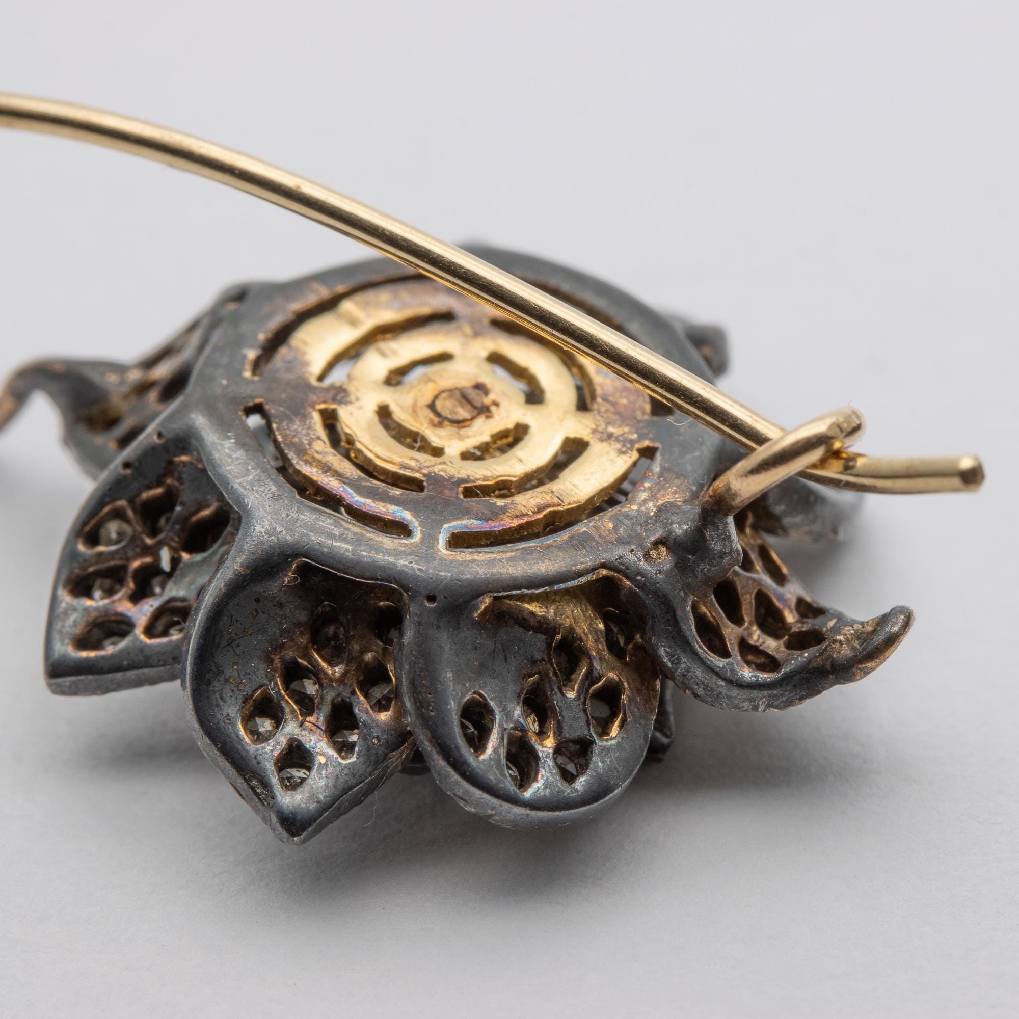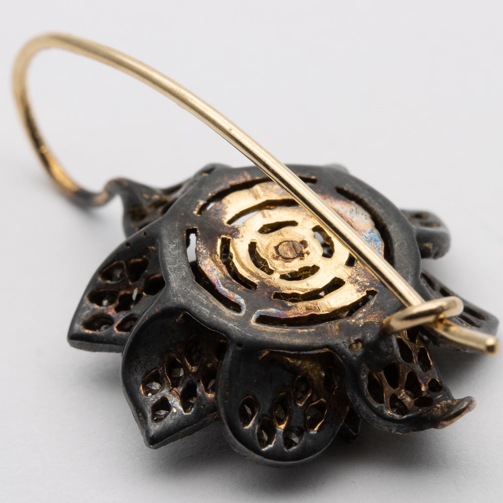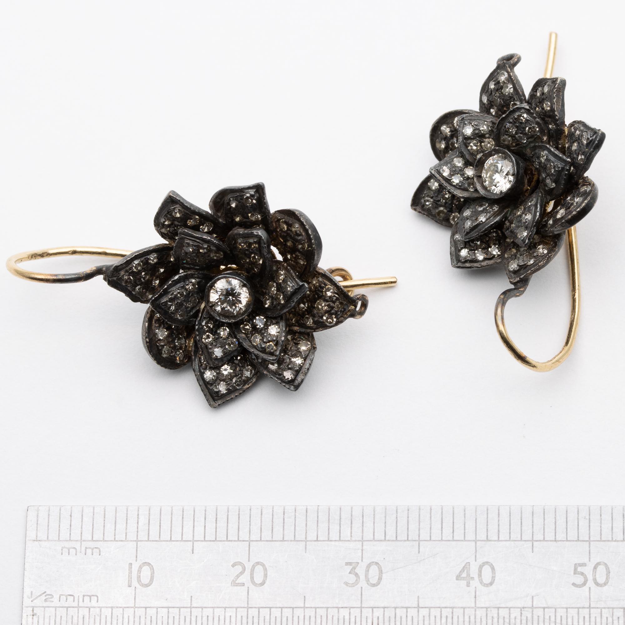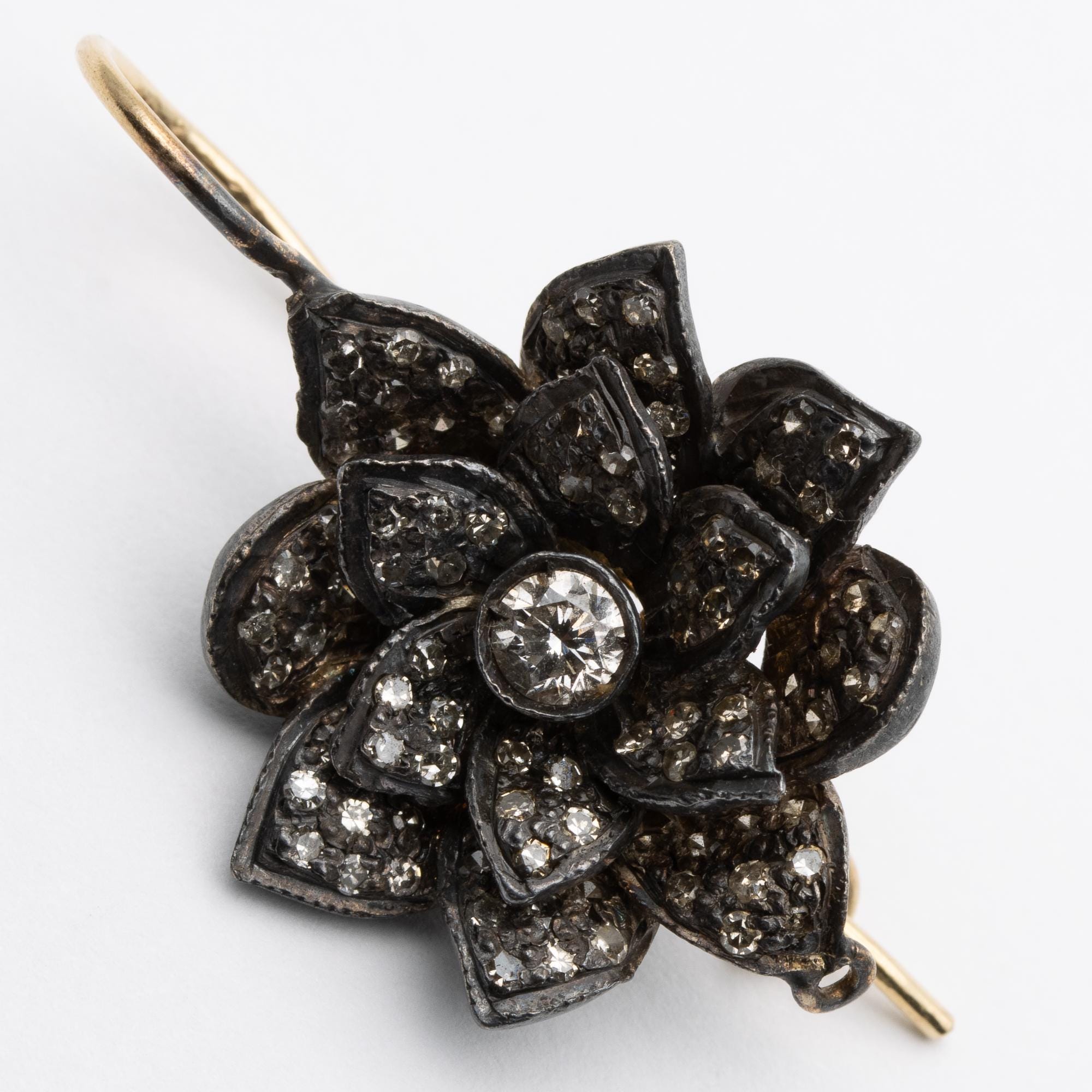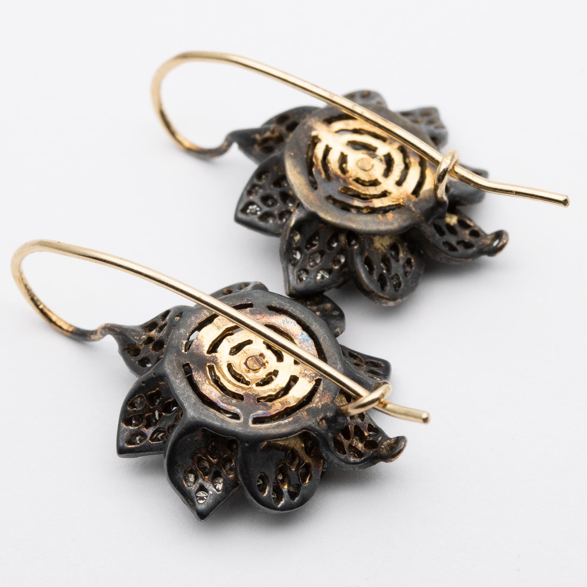 in good used condition. Really unusual blackened 18ct gold earrings set with approx. 70 x 1-1.5mm diamonds in each plus a central 3mm diamond. Believed to have been converted to hooks, missing a drop from the bottom.
