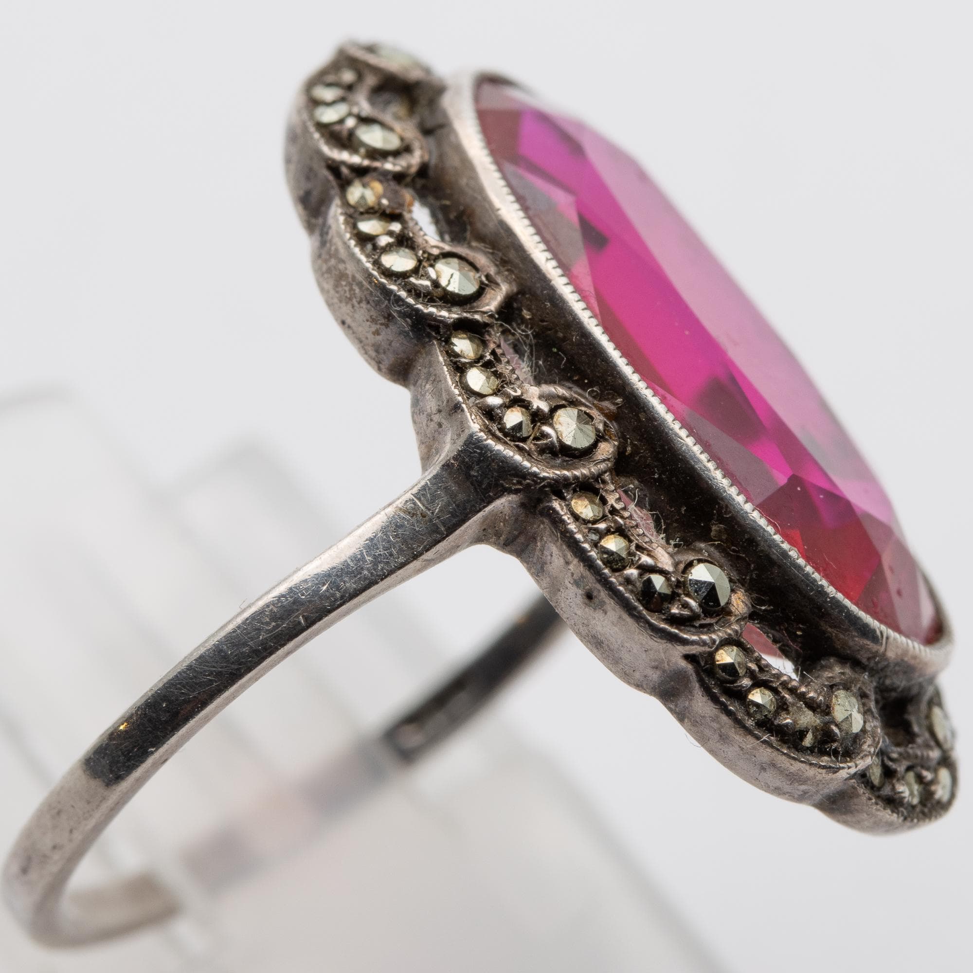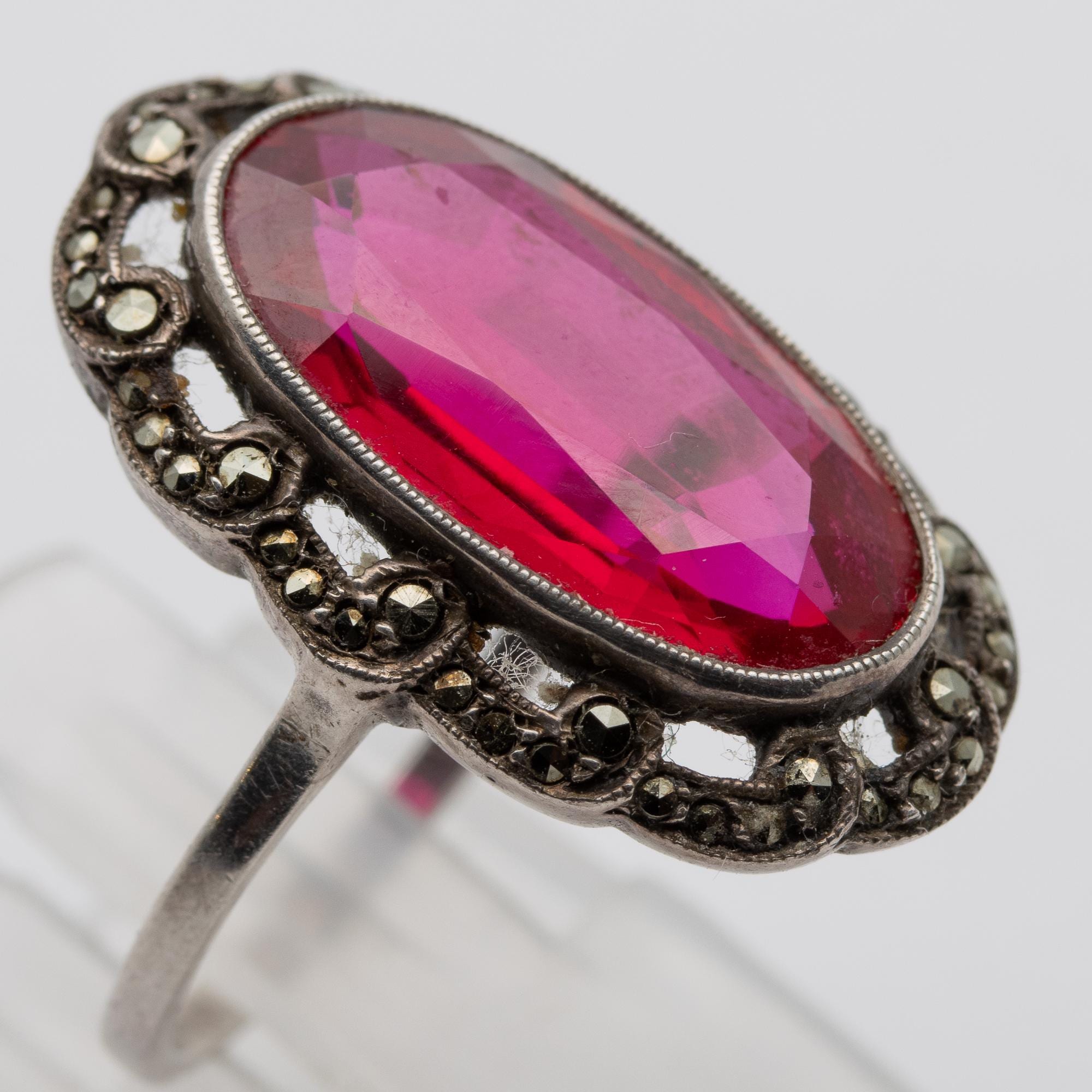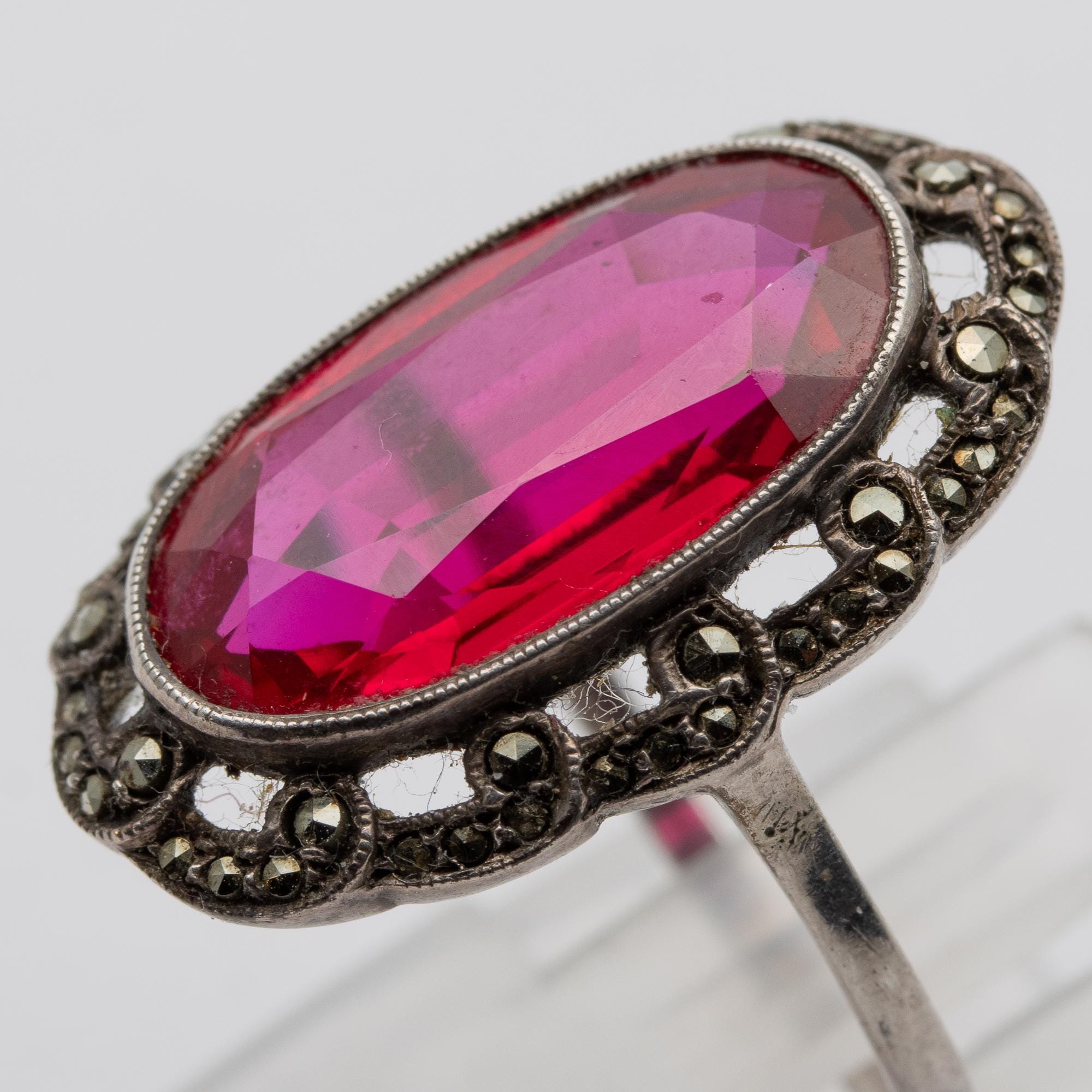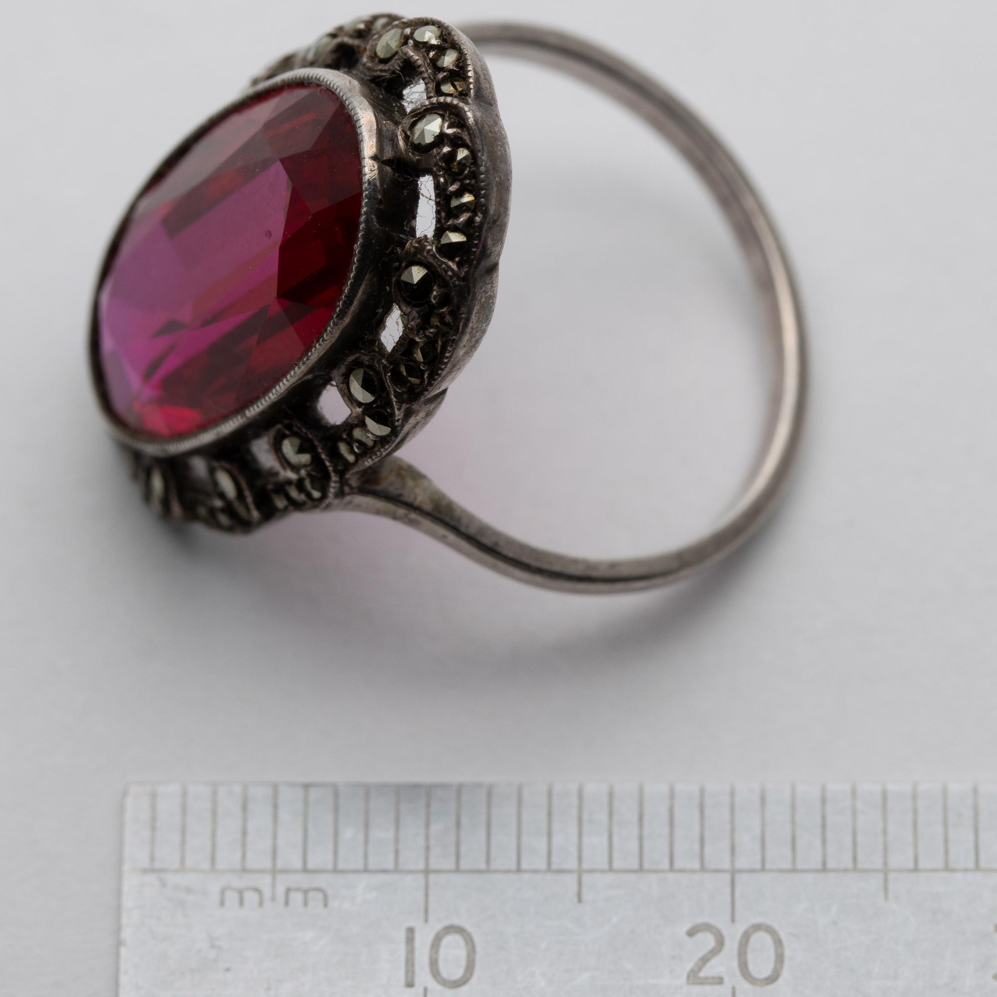 in good used condition. Cool statement piece, likely made in Germany in the interwar period. Large synthetic ruby surrounded by marcasite in continental silver.