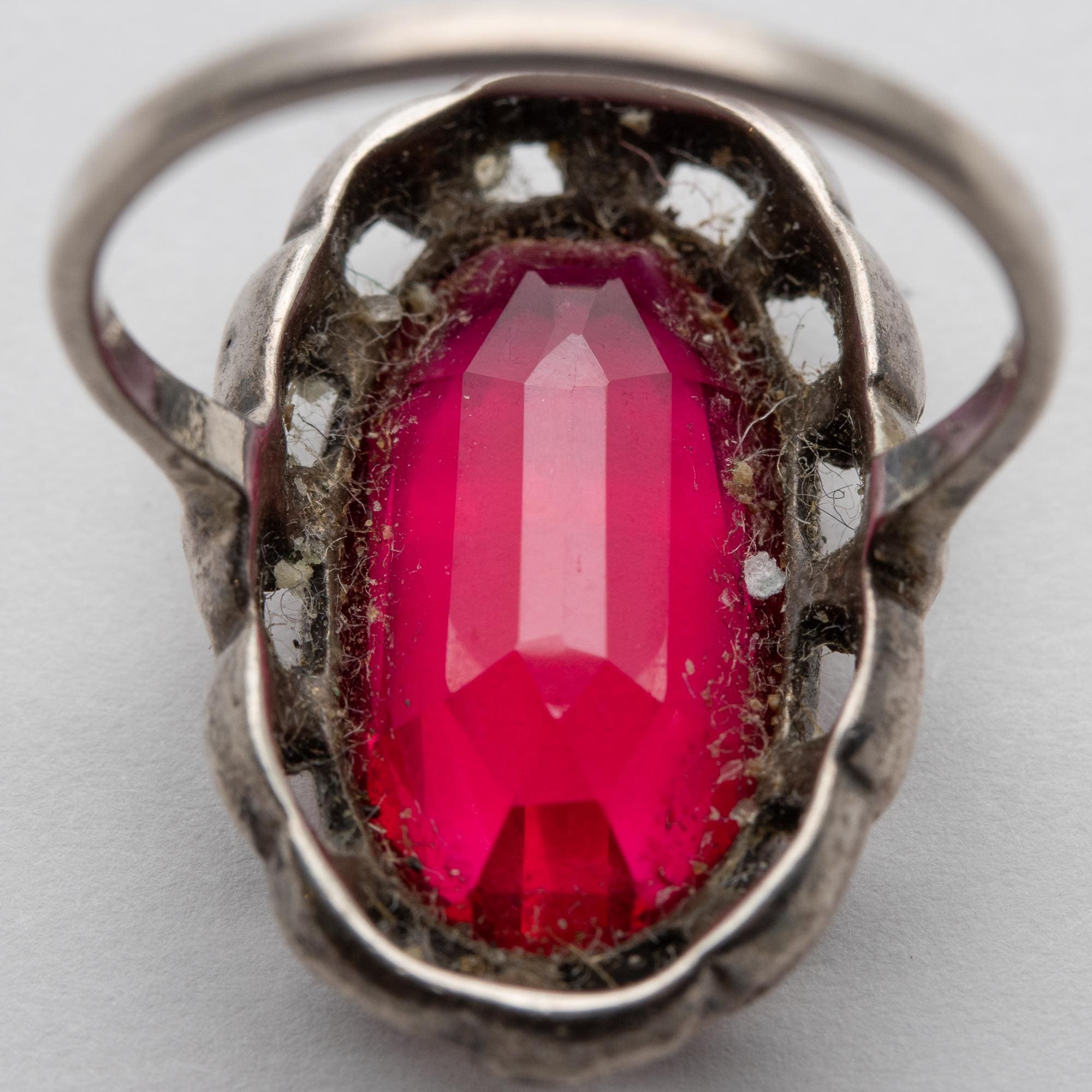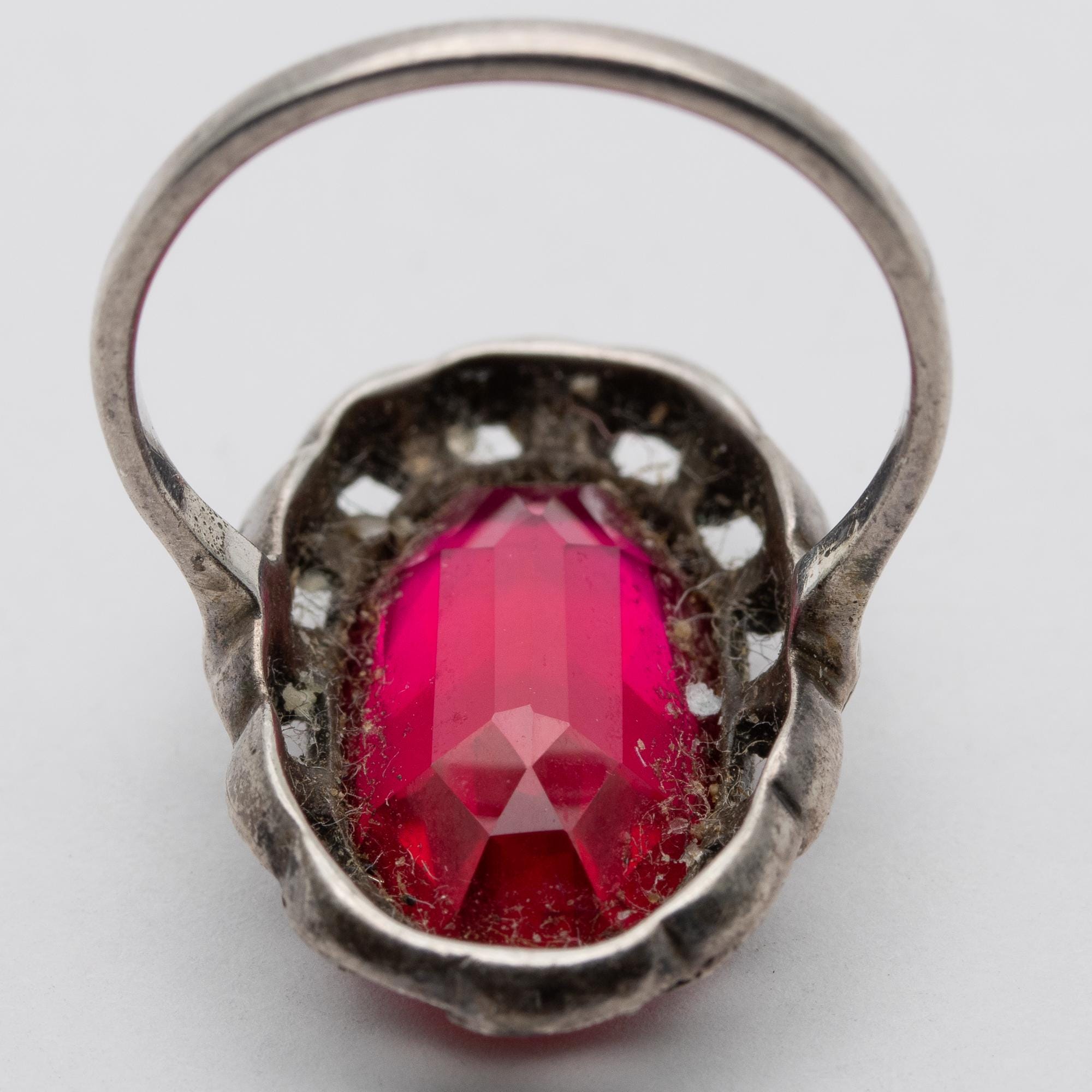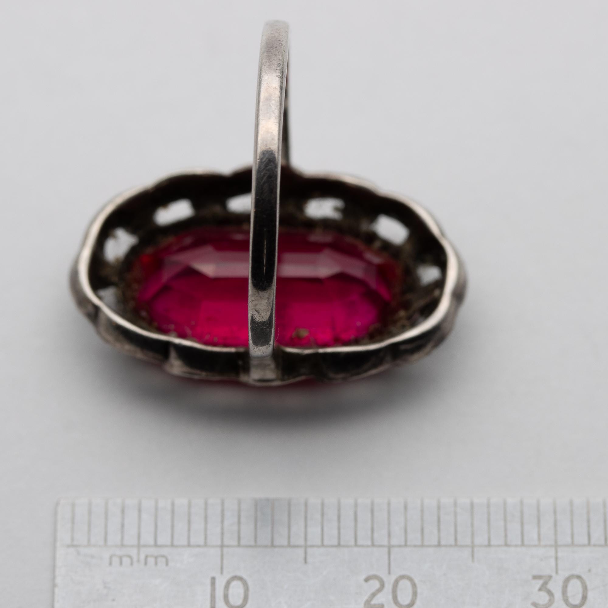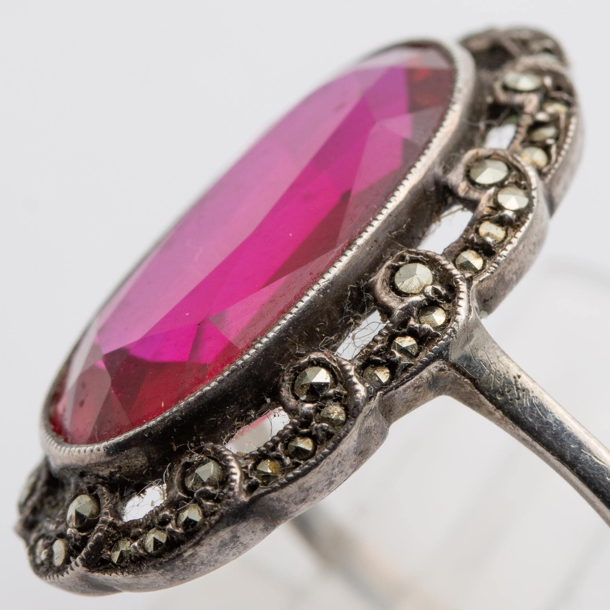 in good used condition. Cool statement piece, likely made in Germany in the interwar period. Large synthetic ruby surrounded by marcasite in continental silver.