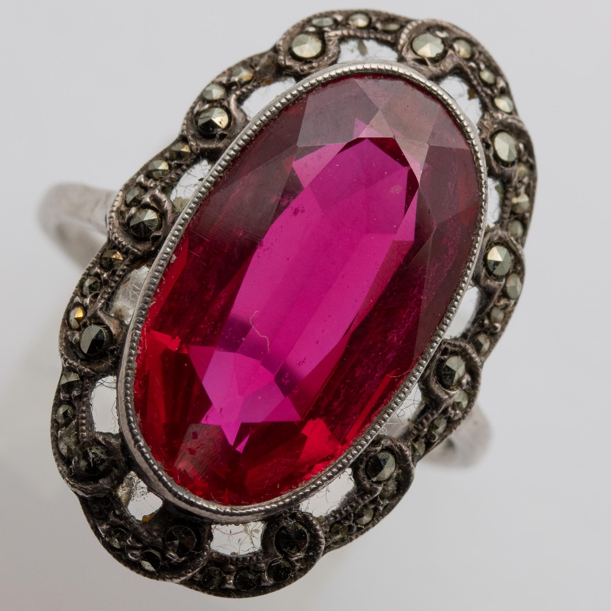 Antique Art Deco Silver Synthetic Ruby & Marcasite Cocktail Ring – Size Q