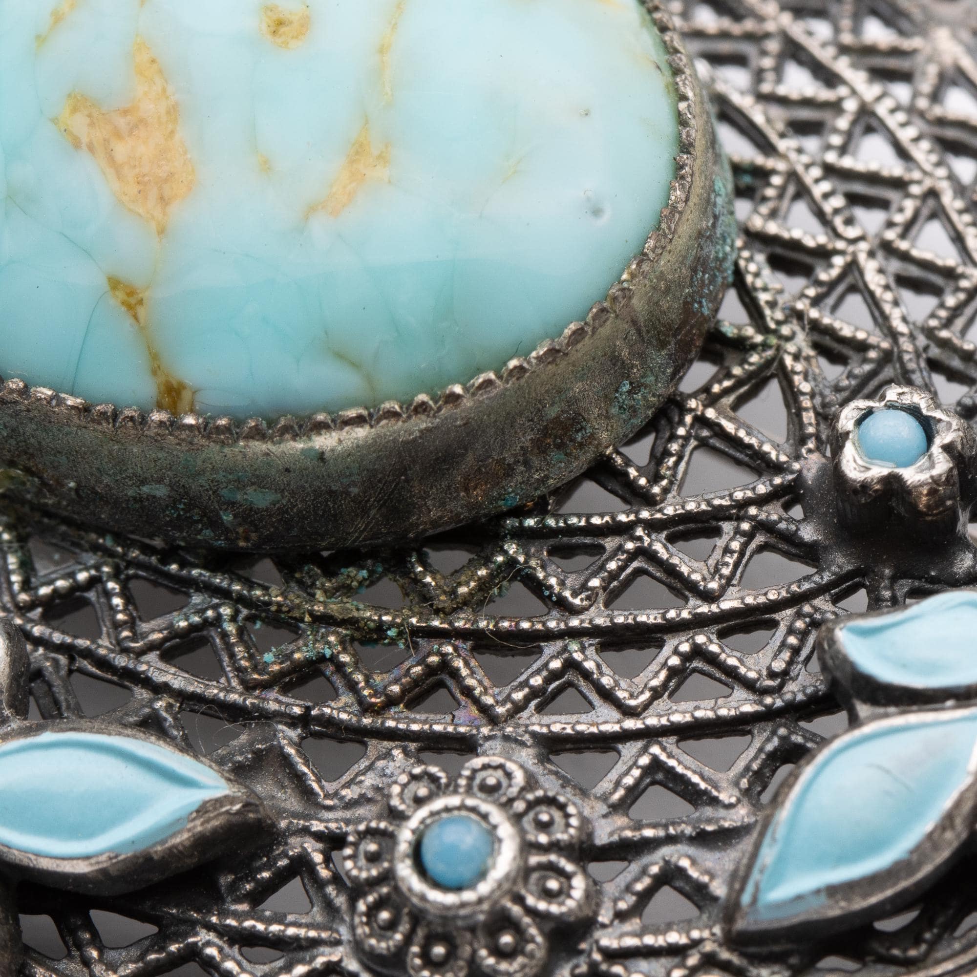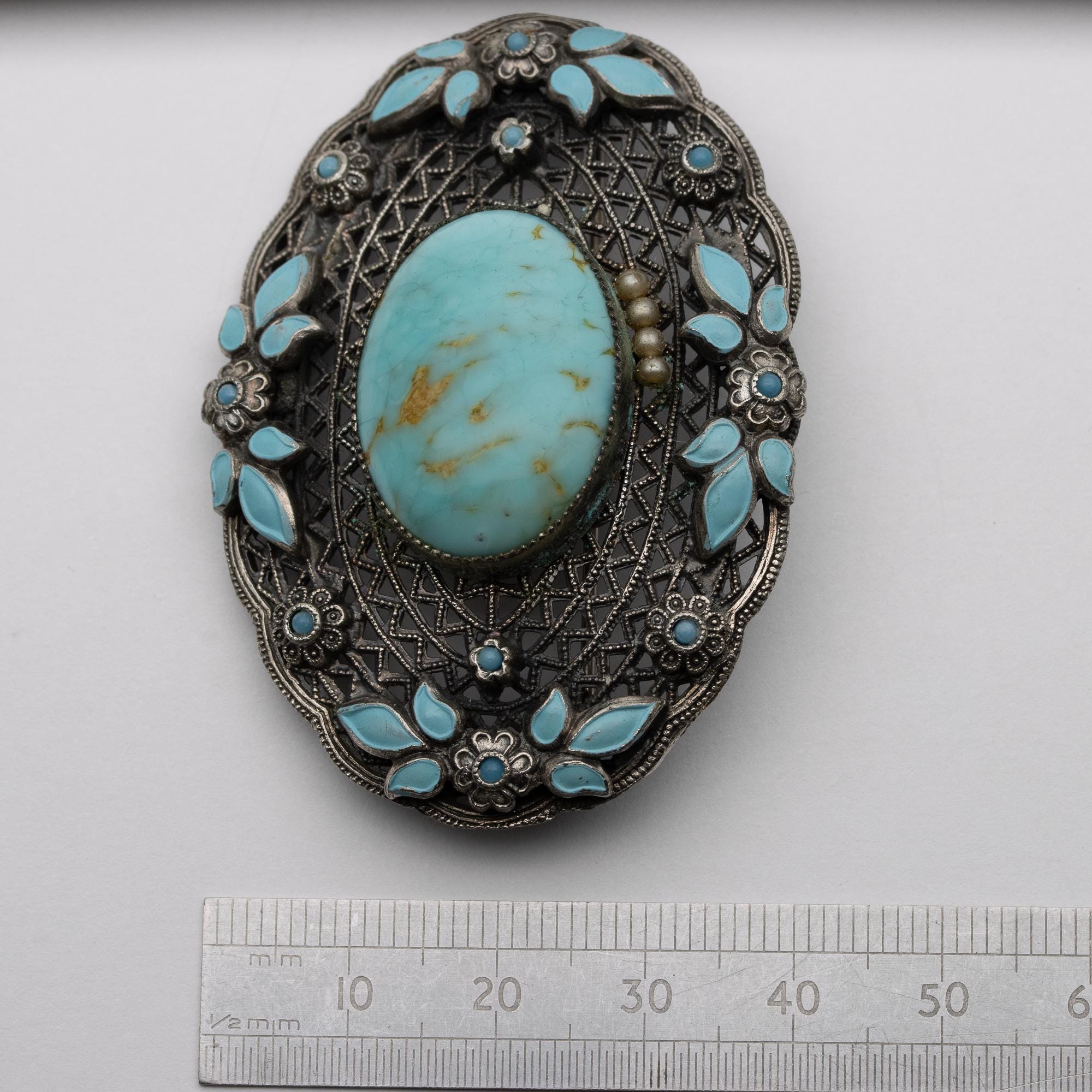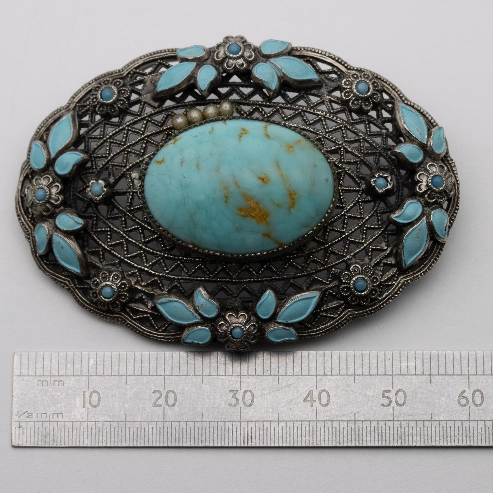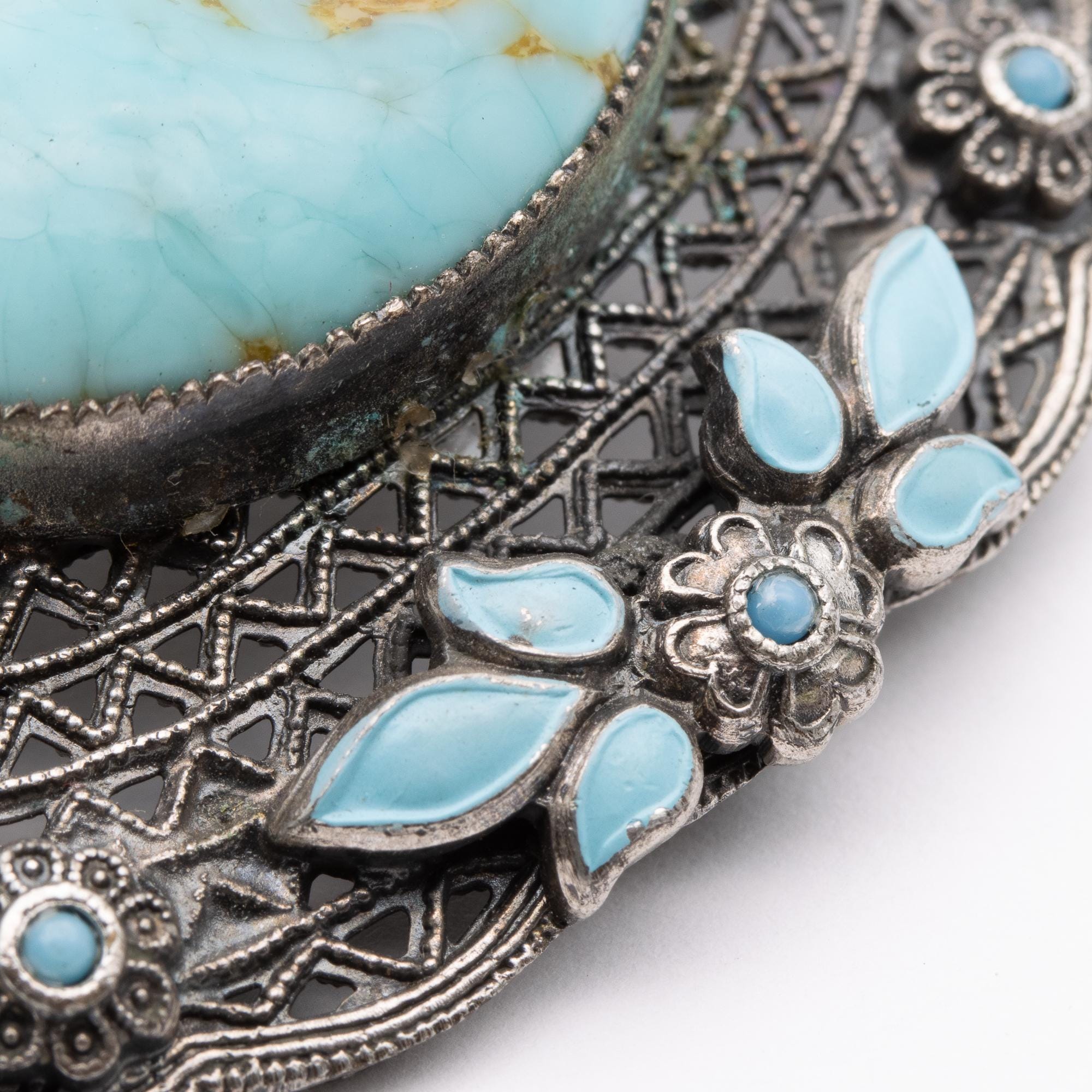 Pretty Vintage Czech Hubbell Glass Faux Turquoise Enamel Filigree Brooch