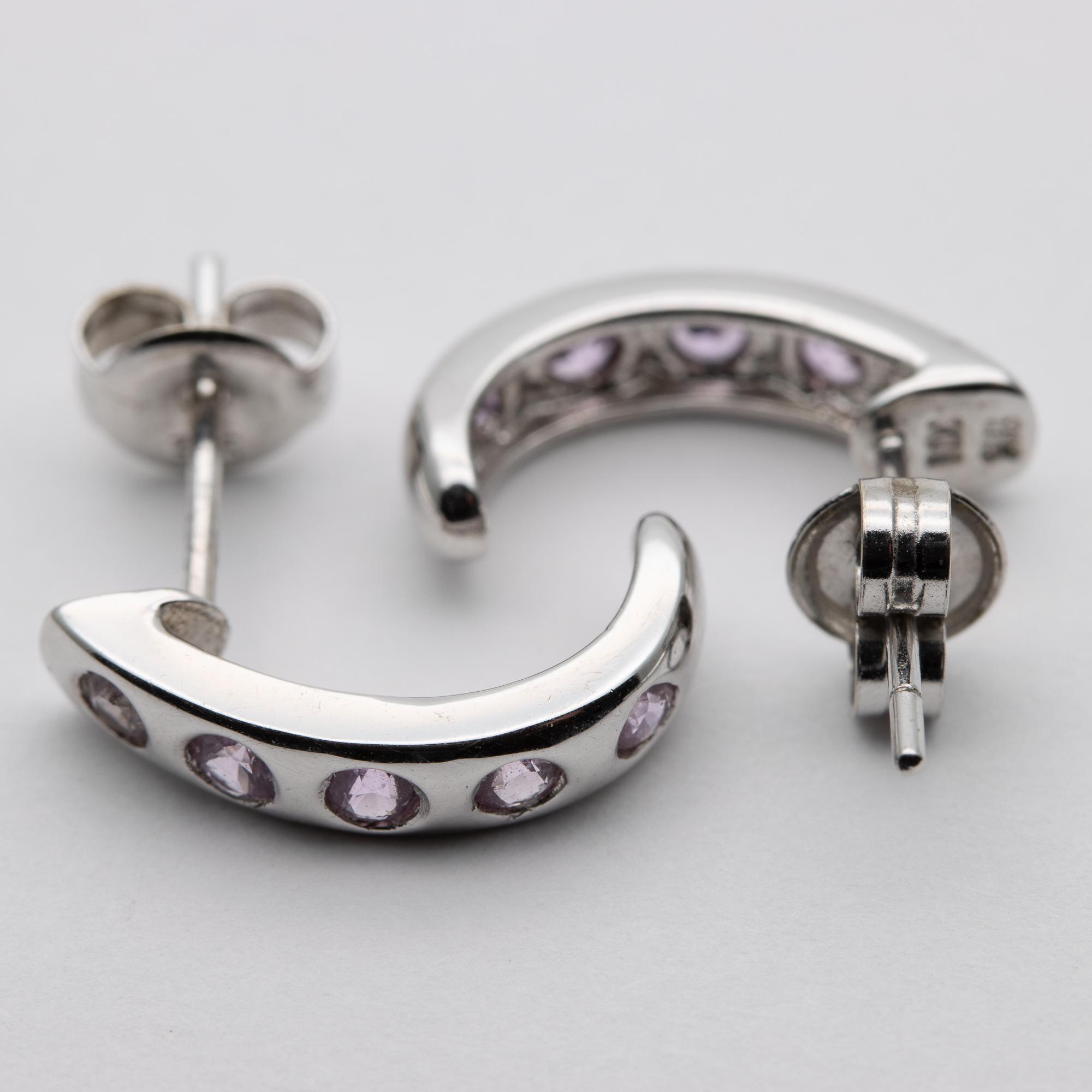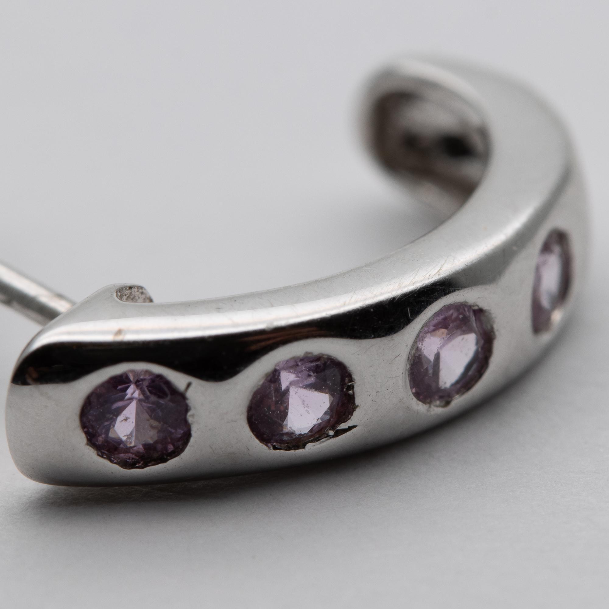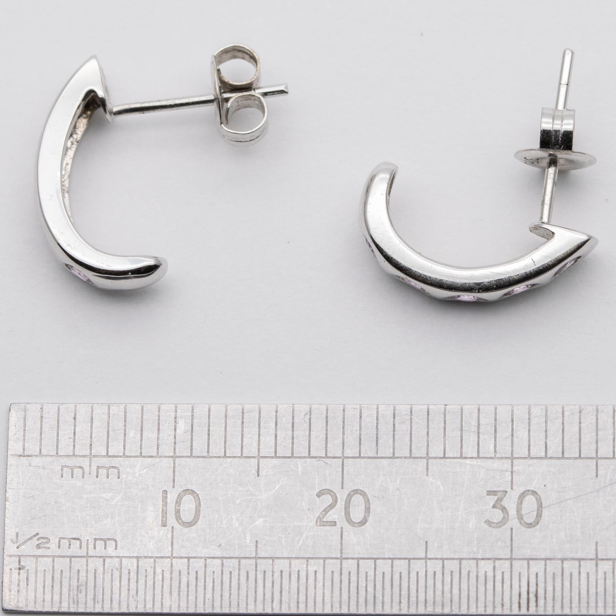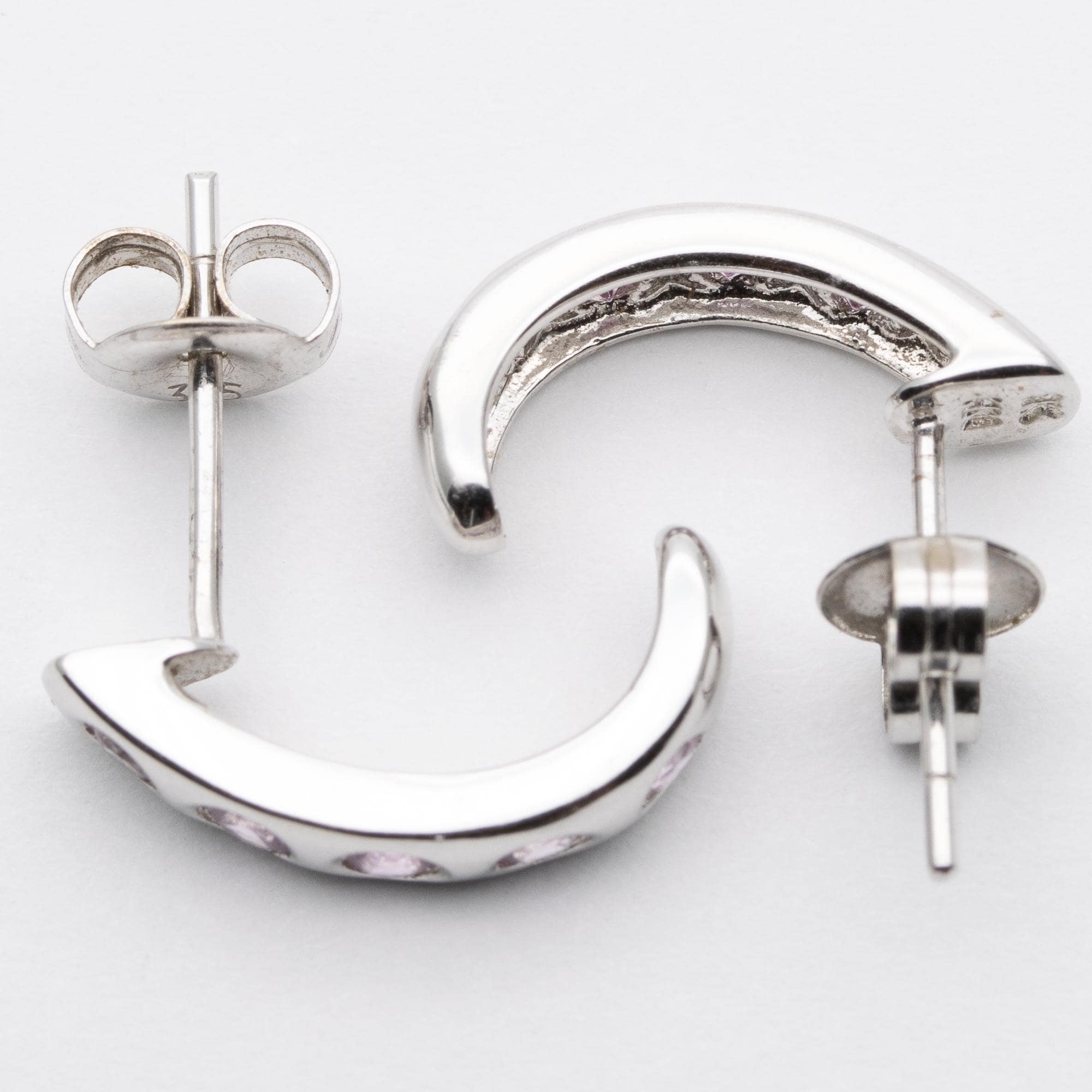 in good used condition. Elegant half hoop earrings in white gold set with pink spinel, likely synthetic. For pierced ears with butterfly backs.