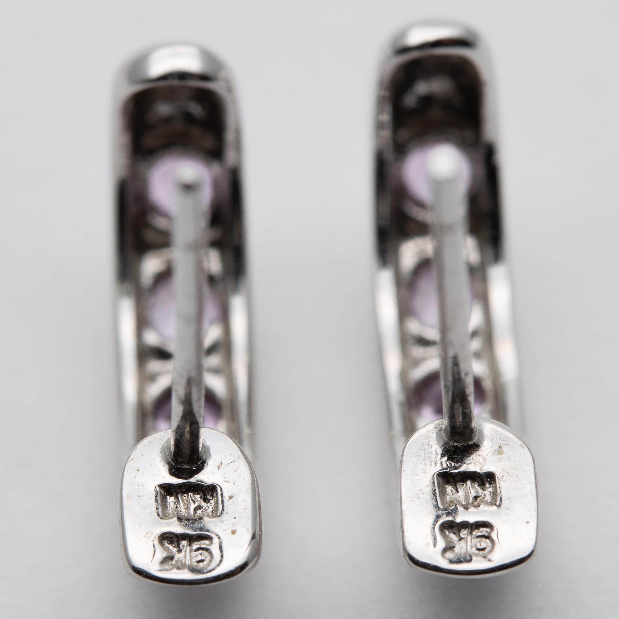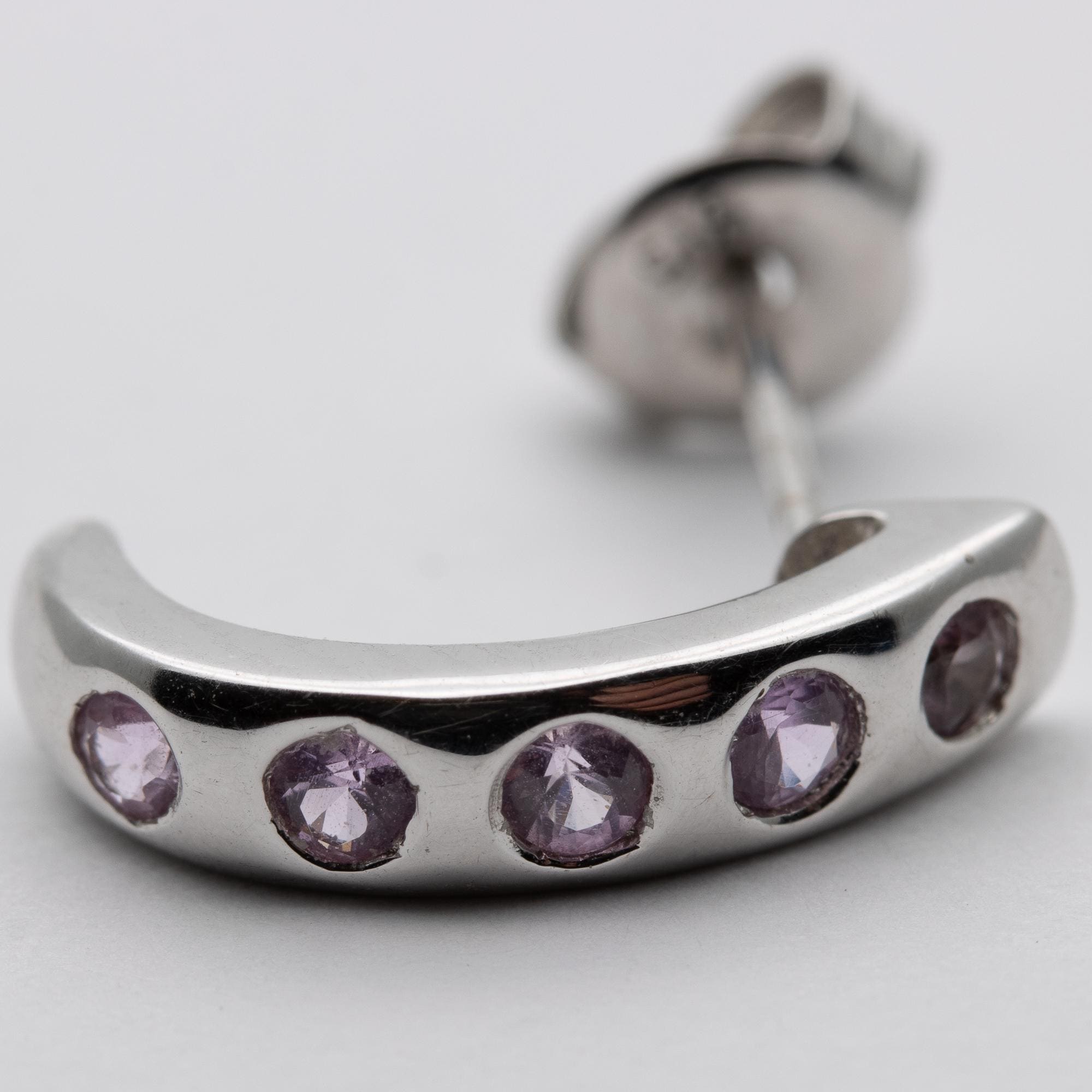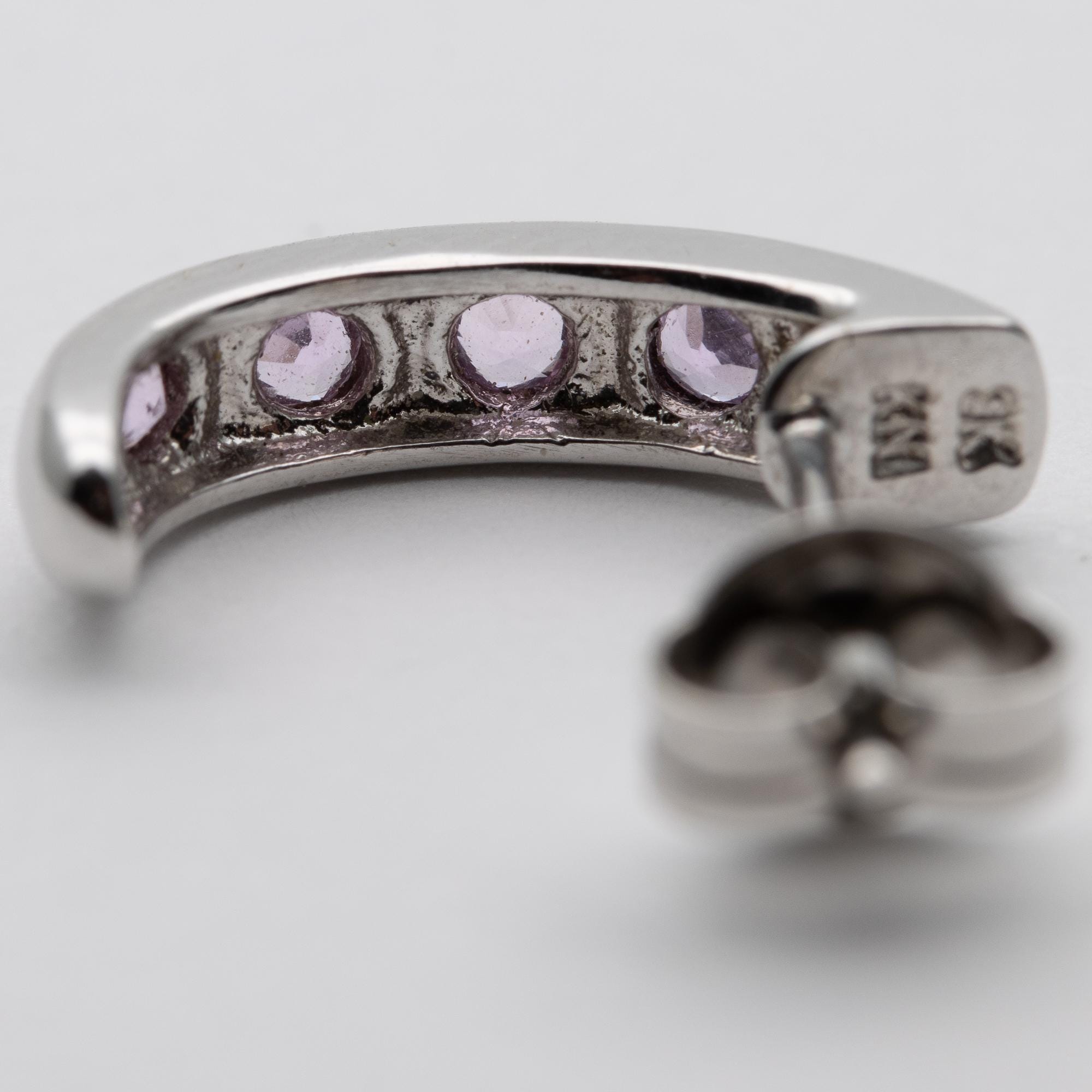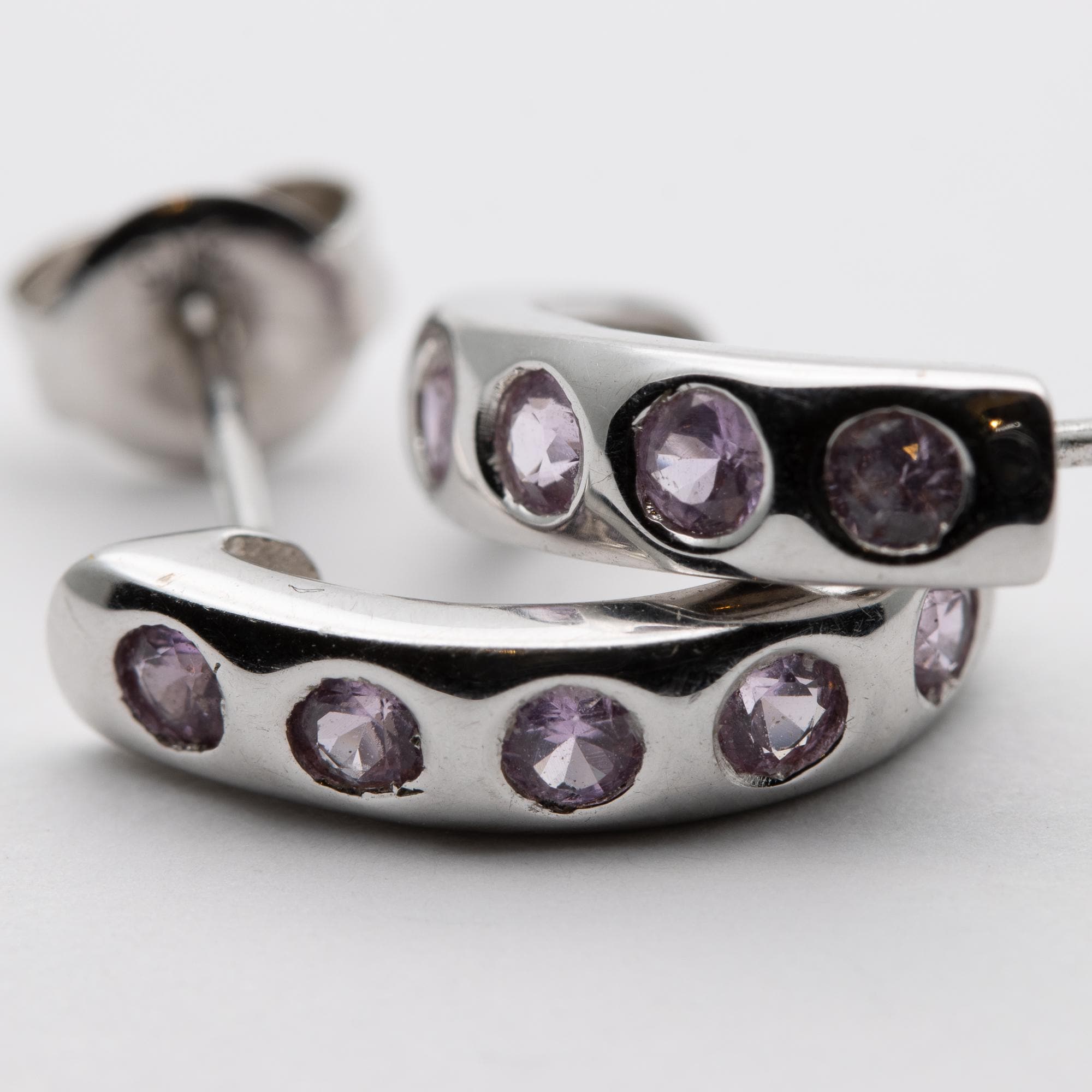 in good used condition. Elegant half hoop earrings in white gold set with pink spinel, likely synthetic. For pierced ears with butterfly backs.
