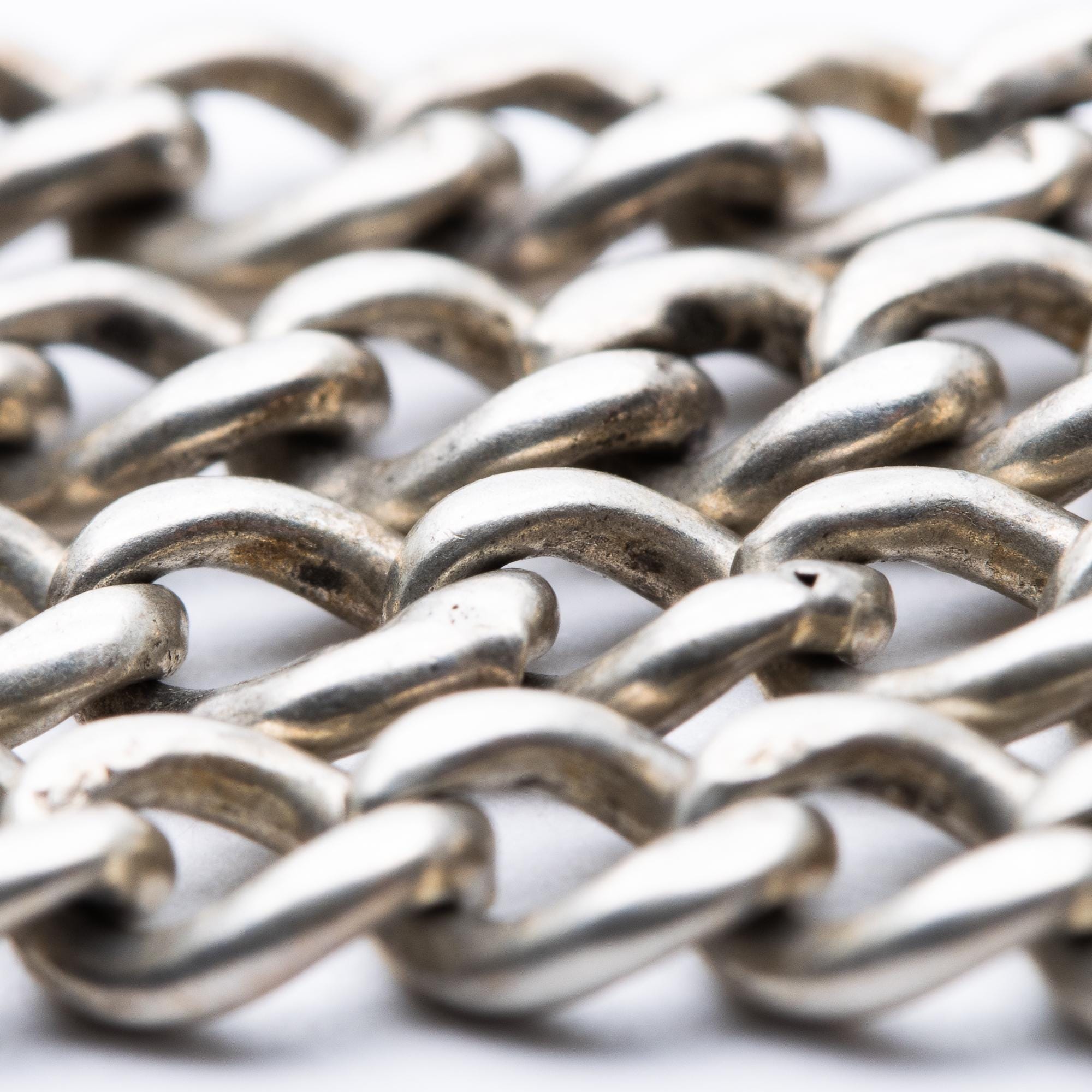 in good used condition. Clicks closed loosely, some wear at hinge, curb link chain.