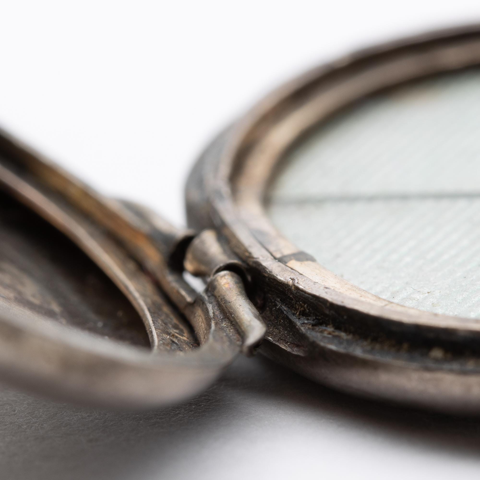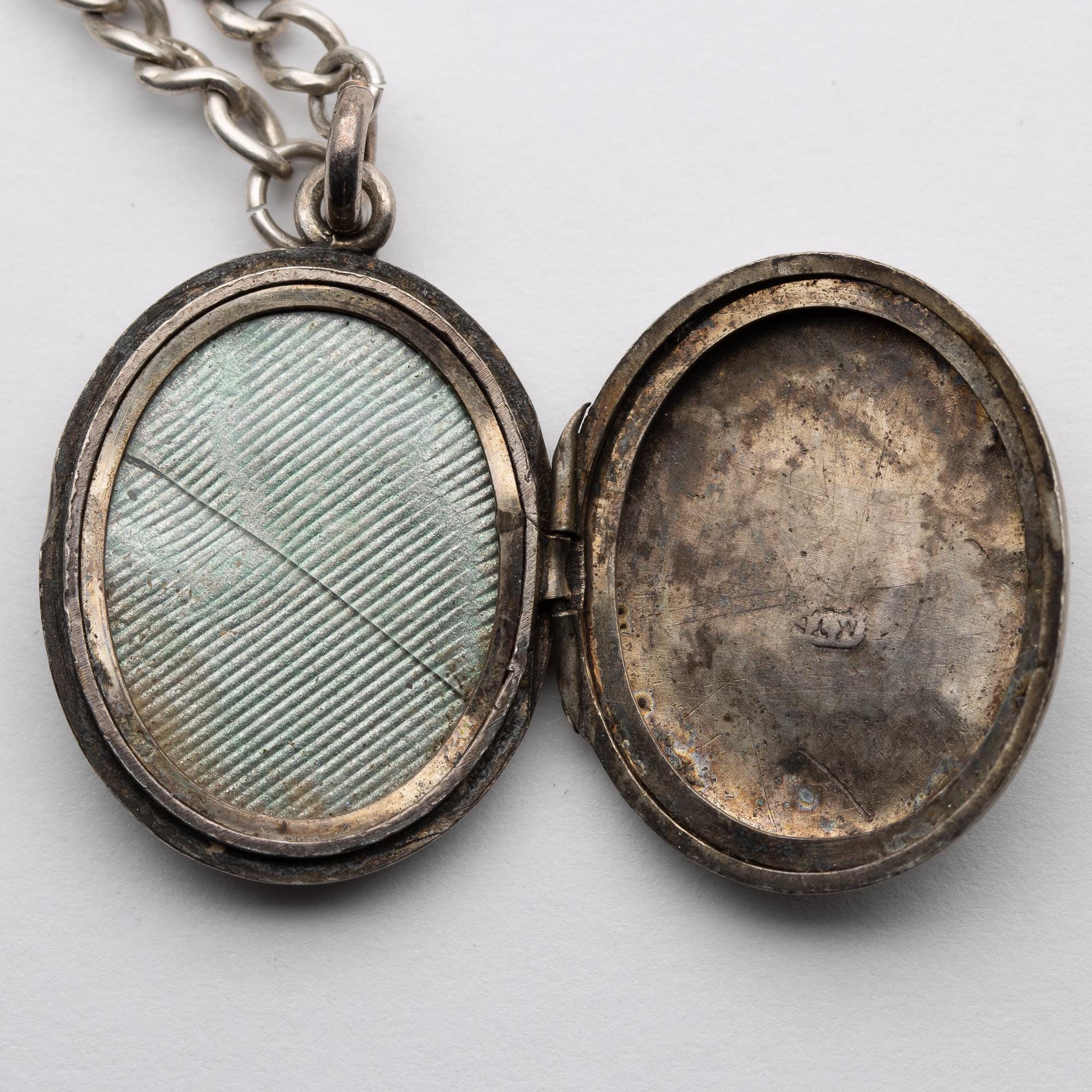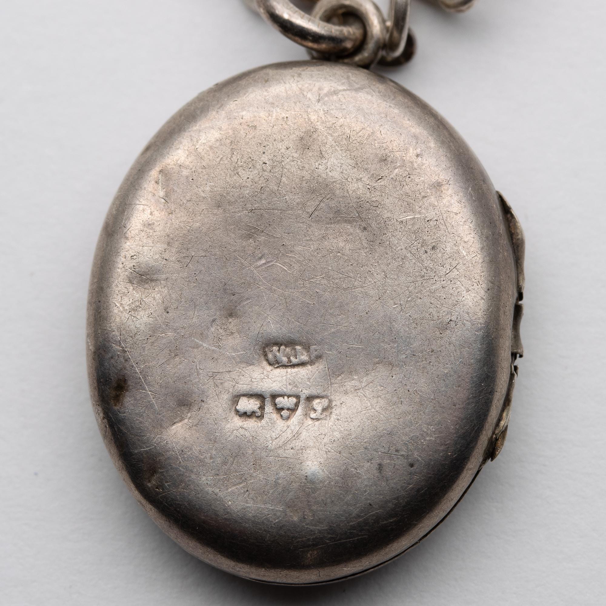 Hallmarks – full UK hallmarks on locket, Chester 1911, maker WJP, chain marked sterling and acid tested.