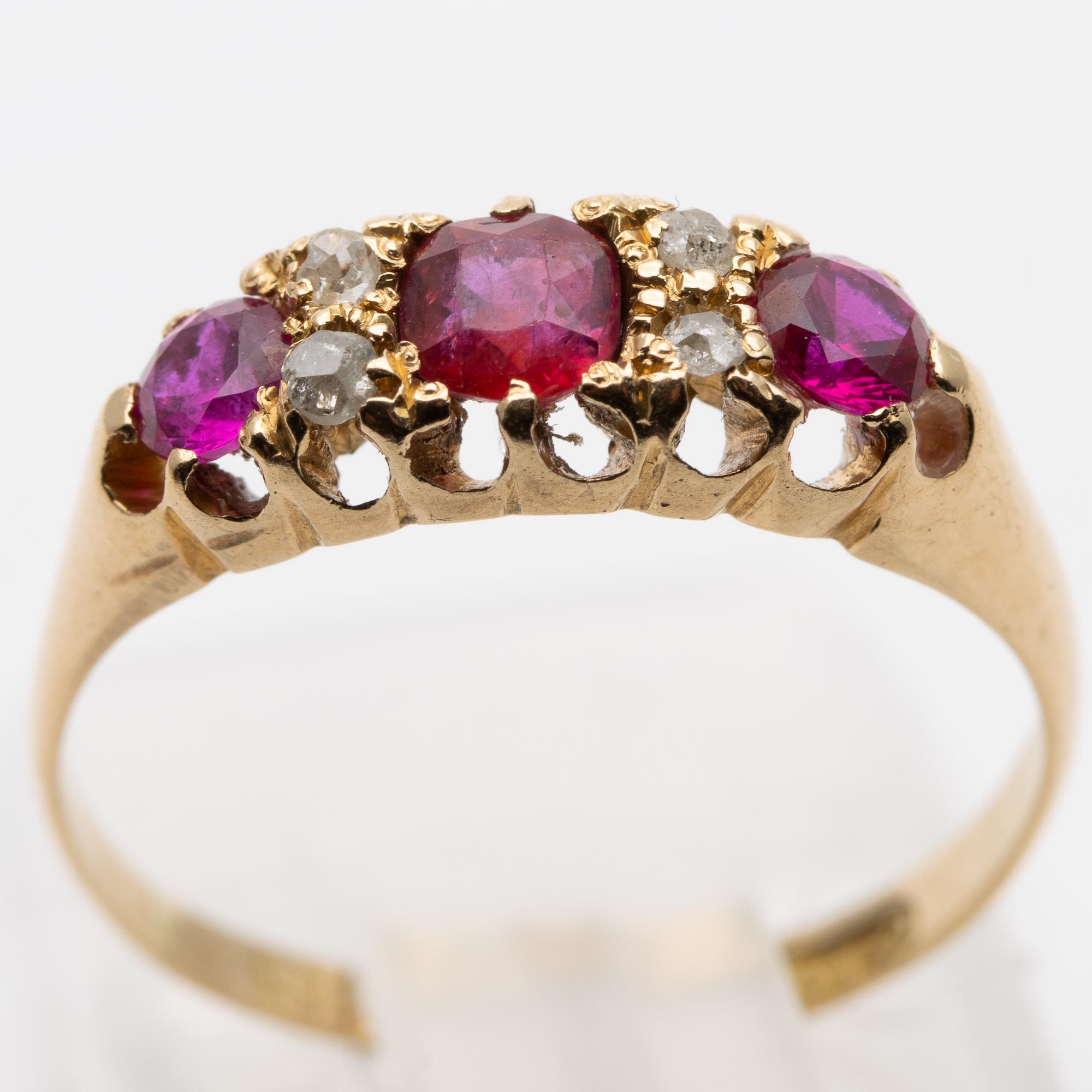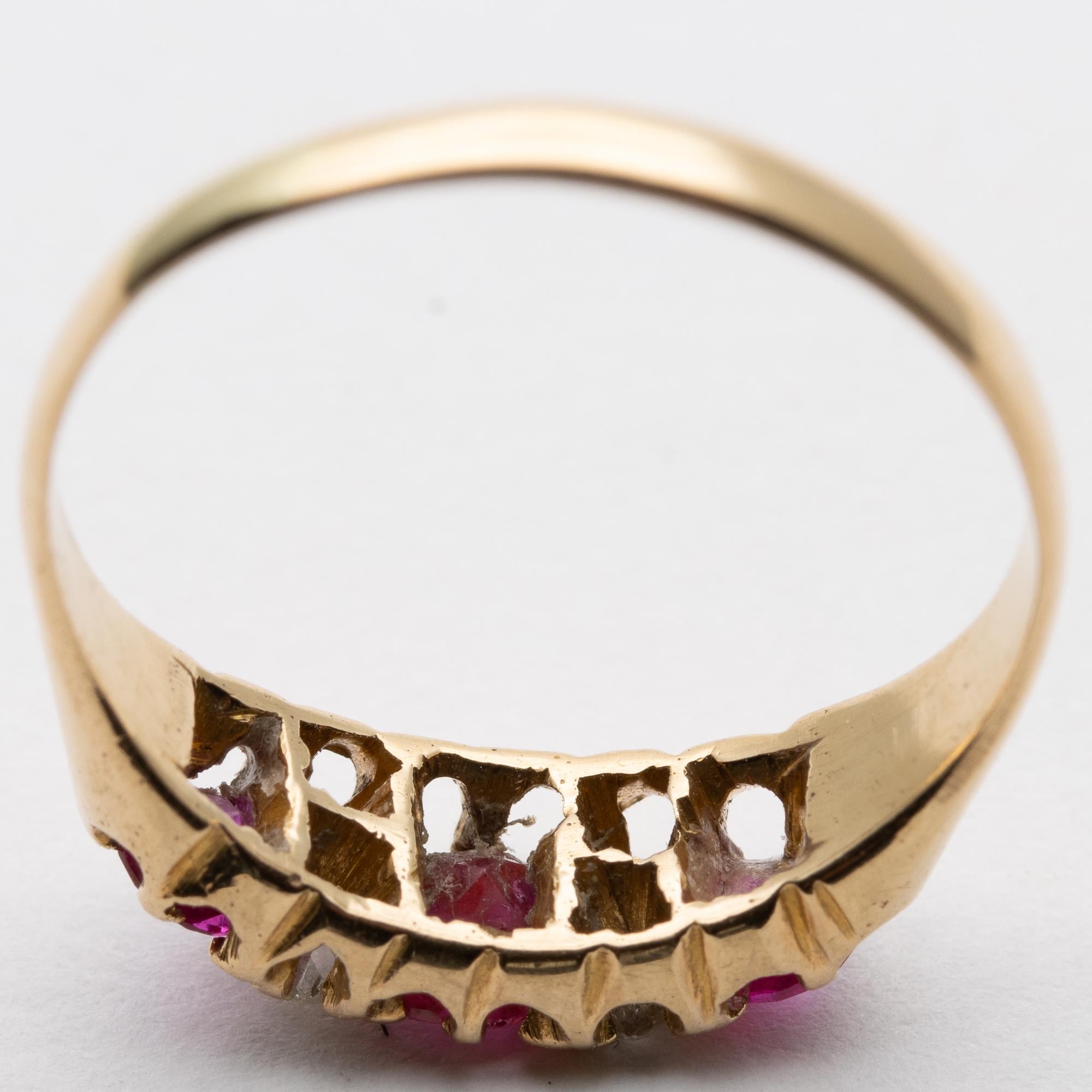 in good used condition. Sweet little boat ring set with central natural heated ruby and 2 synthetic rubies either side and 4 natural round cut diamonds