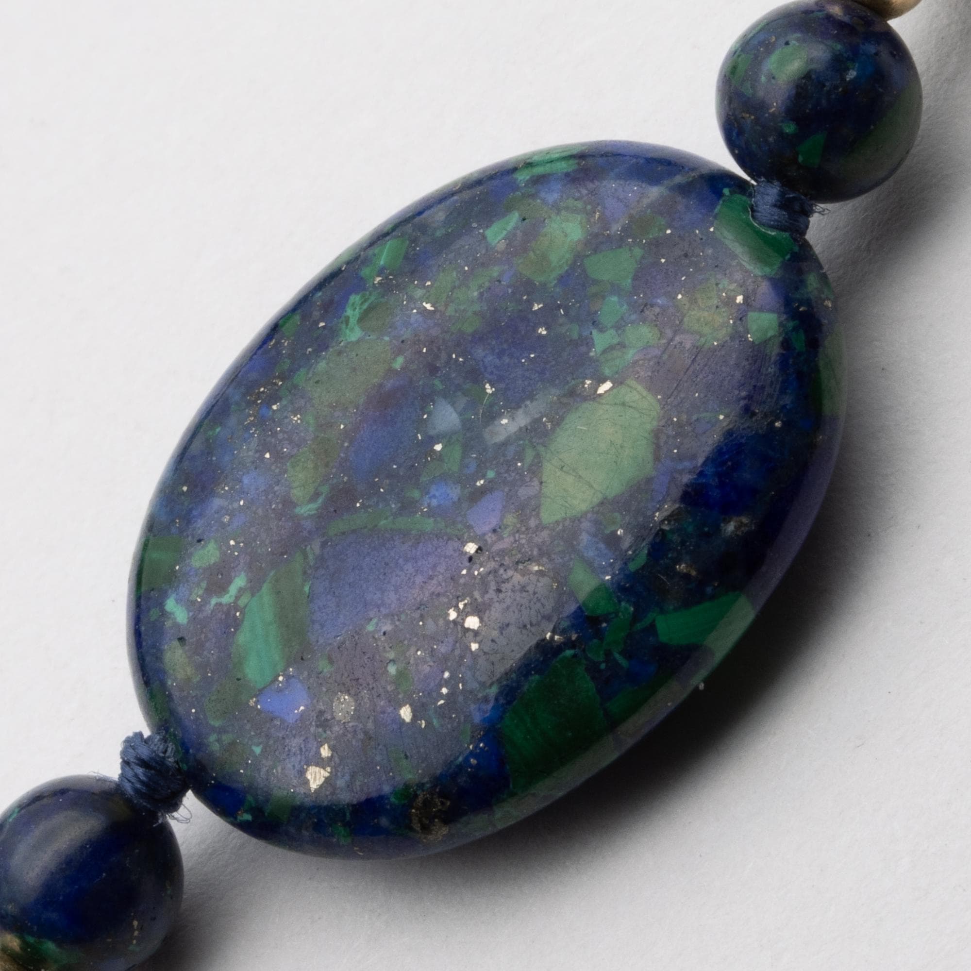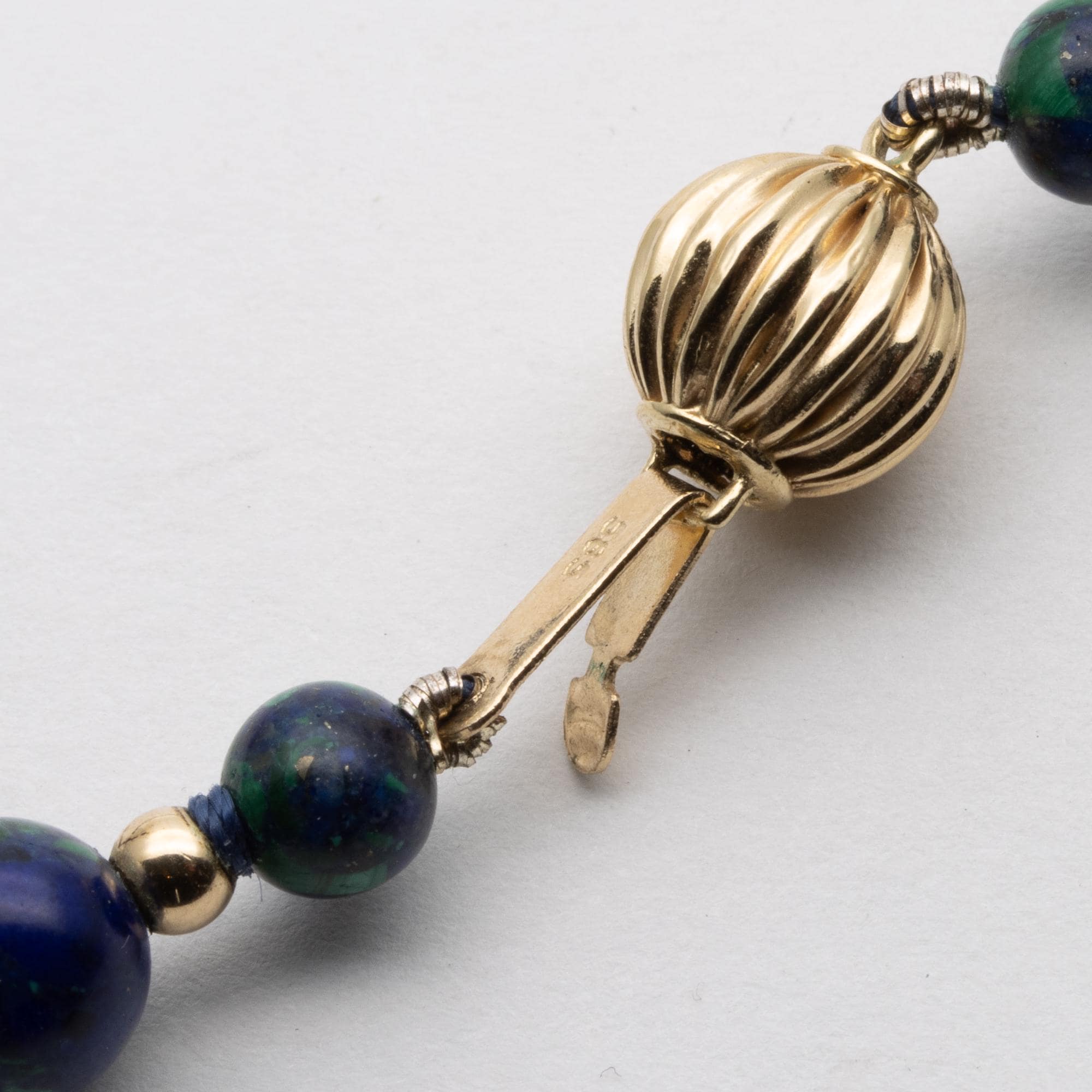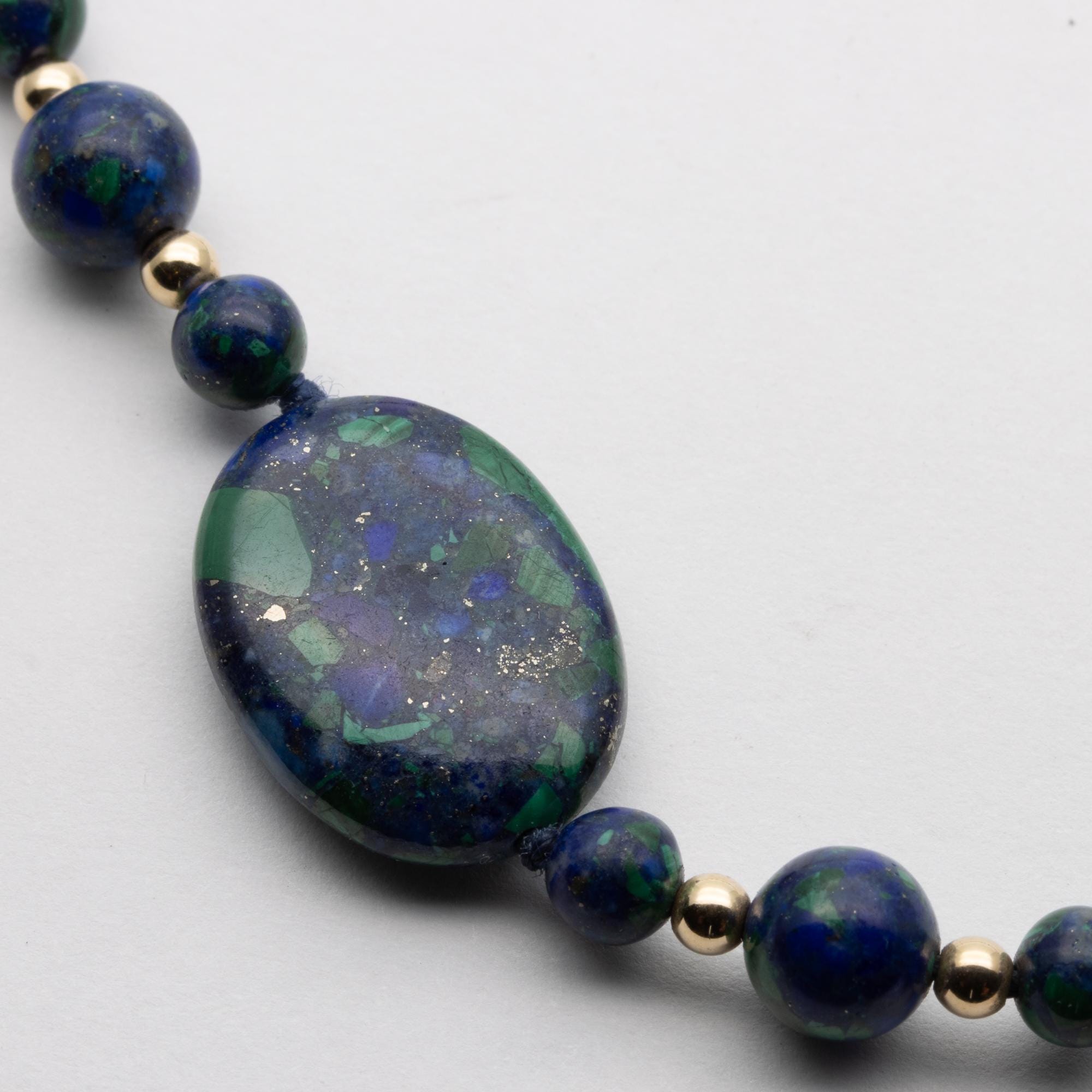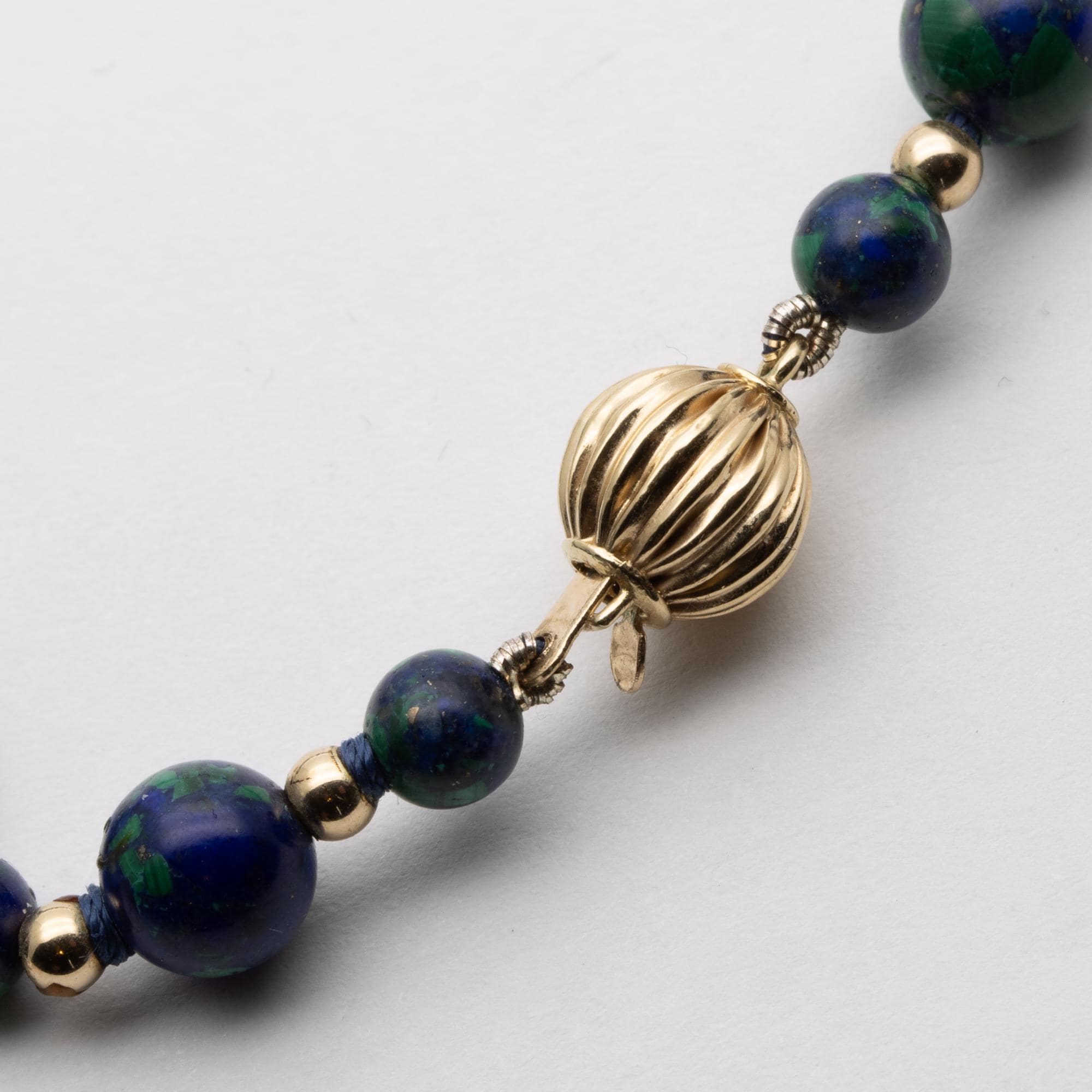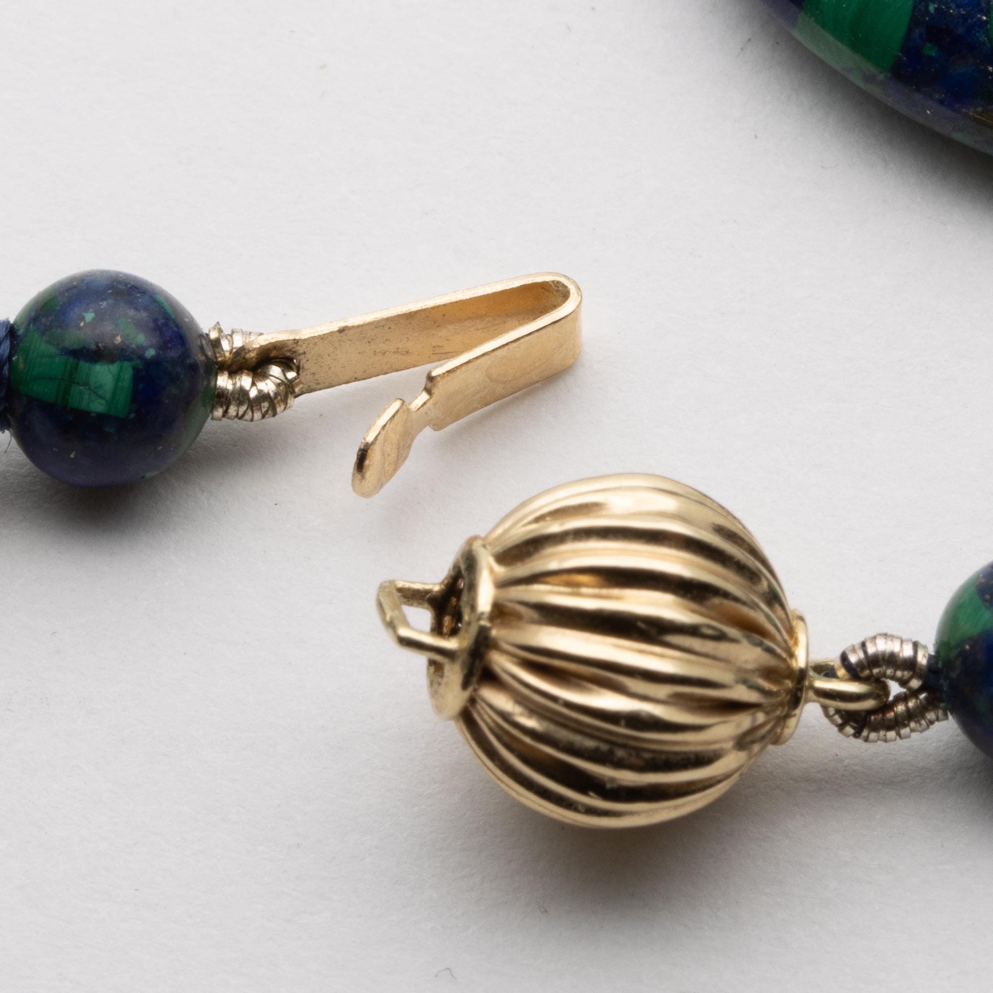 in good used condition. Beautiful composite beads made of lapis lazuli and malachite with 14ct gold spacers and clasp.