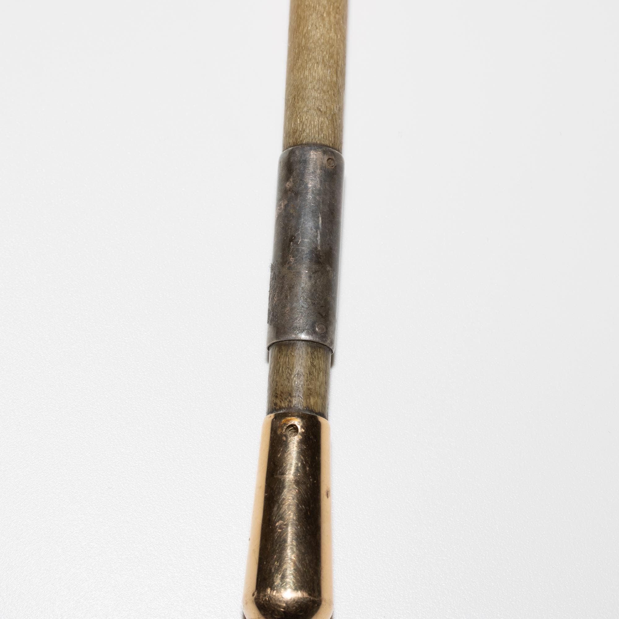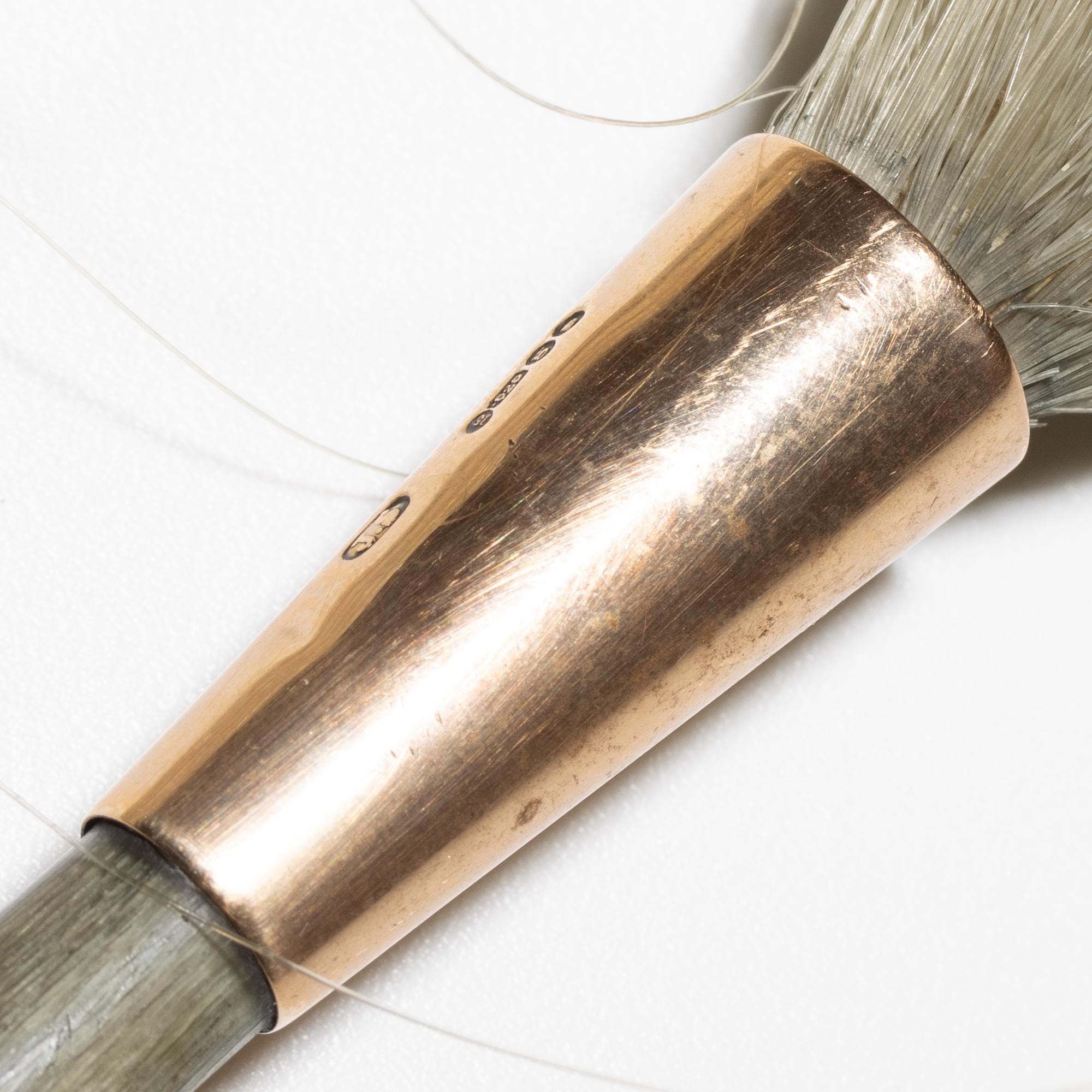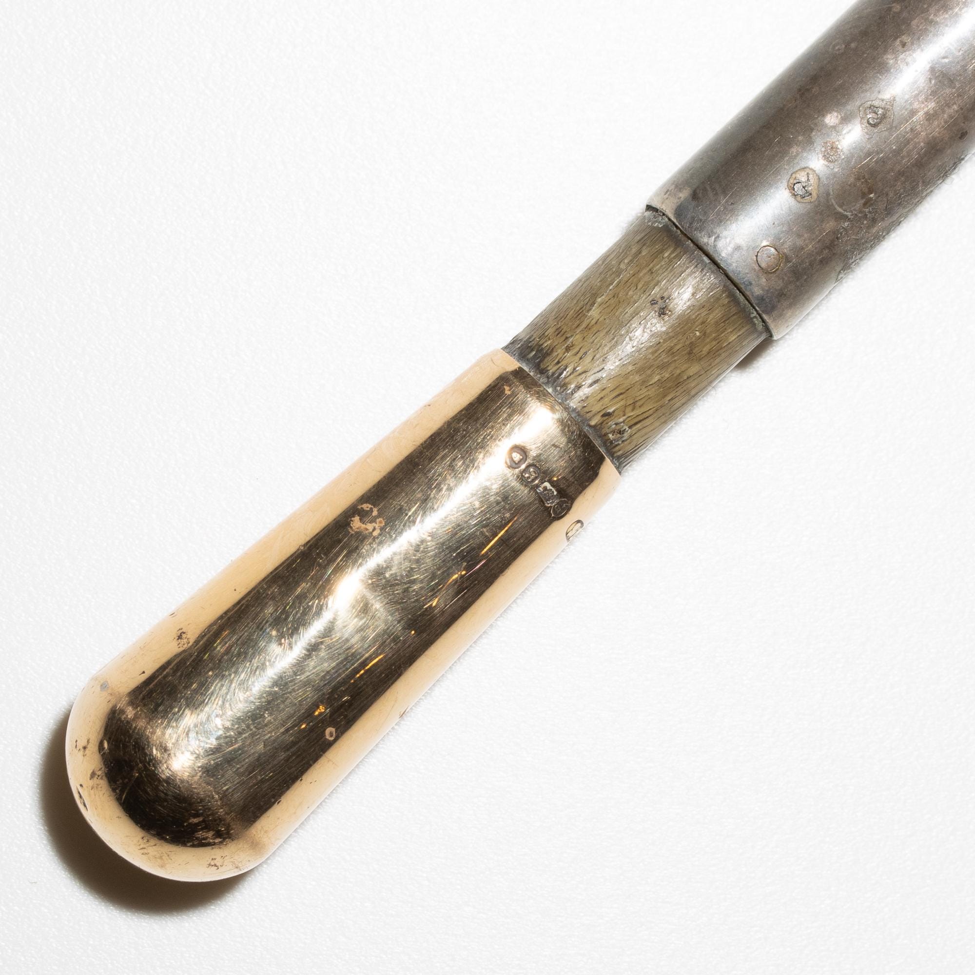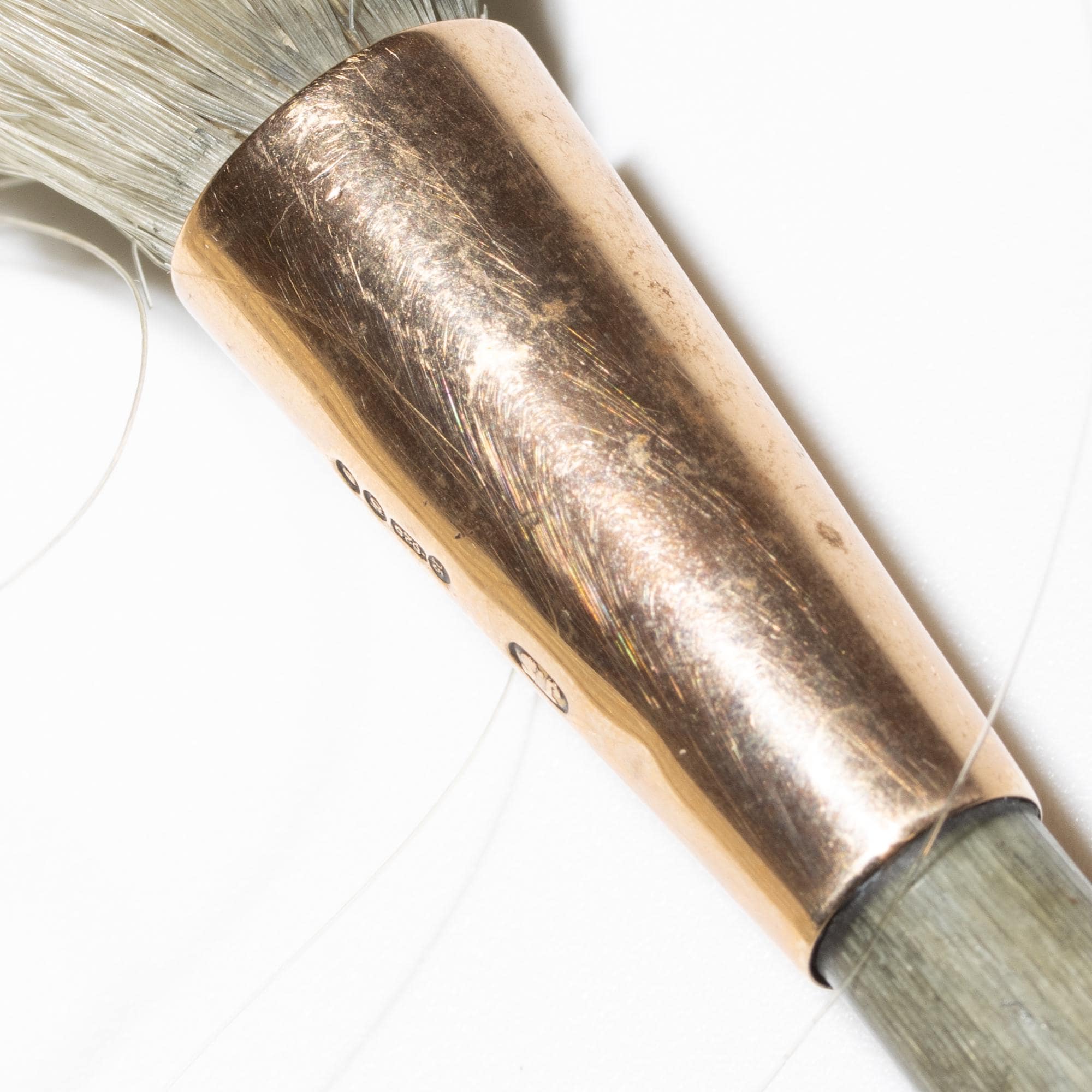 in good used condition. Handle is made of keratinous material, finials are hallmarked 15ct rose gold, possibly horse hair.