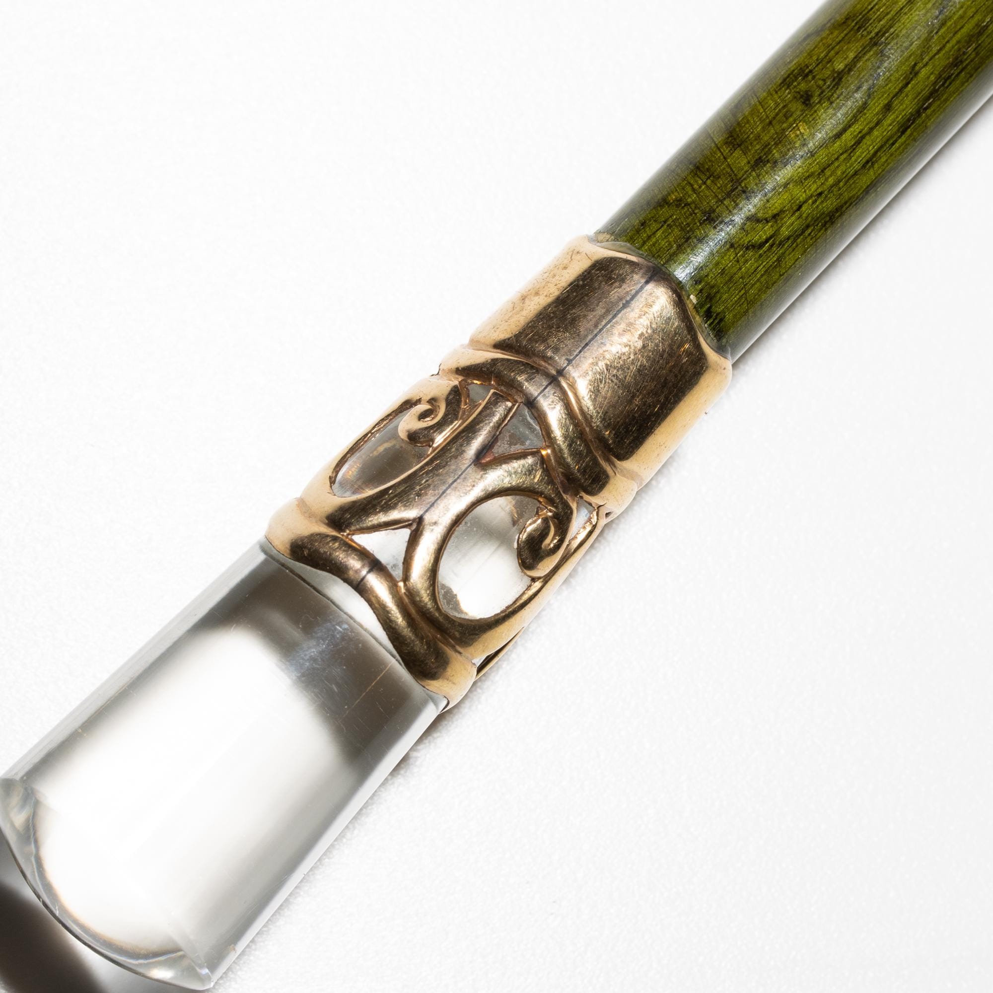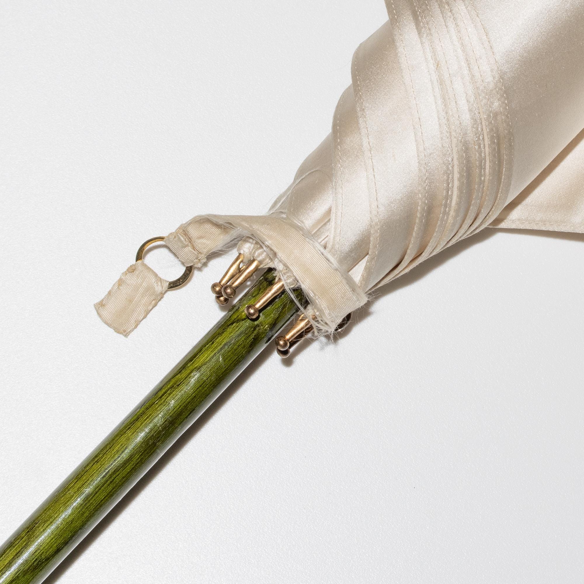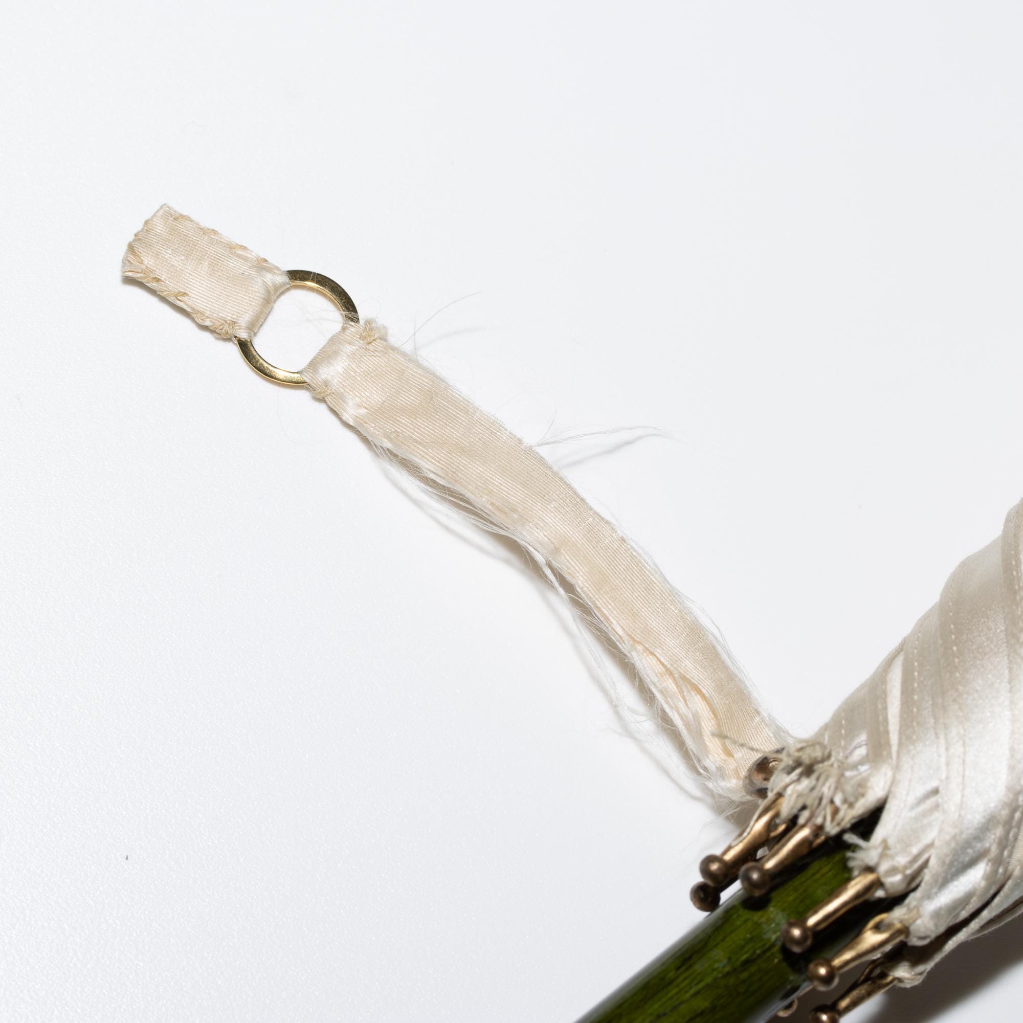 in used condition. Stained green wood handle with rolled gold decoration and glass finial, significant rip in silk – see photos.