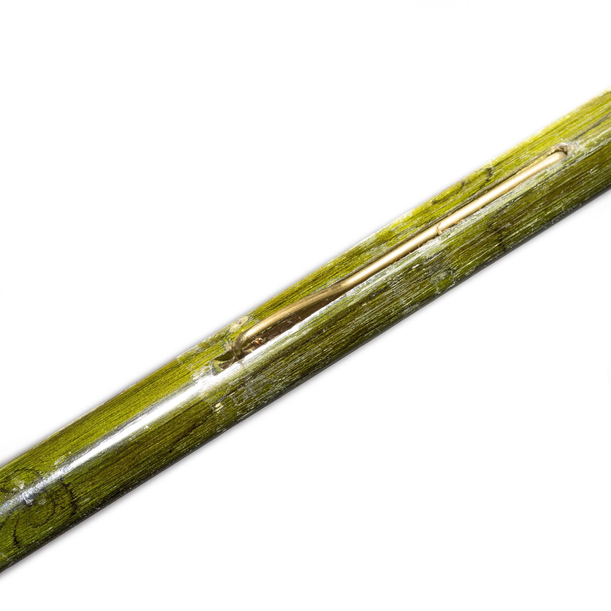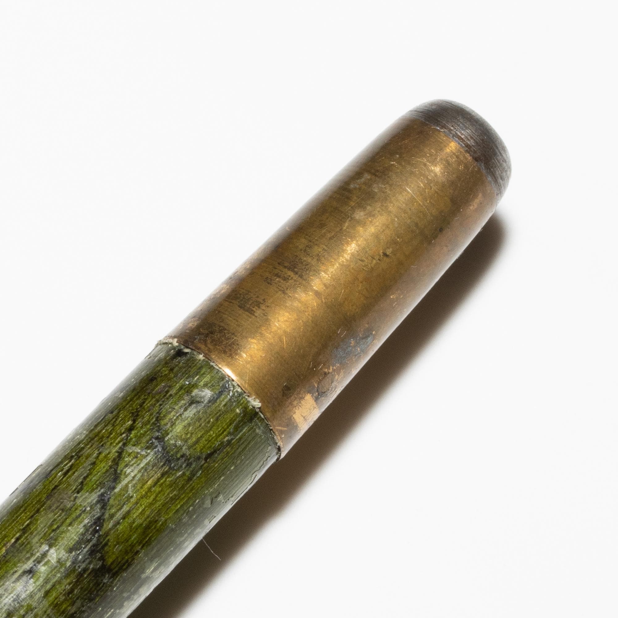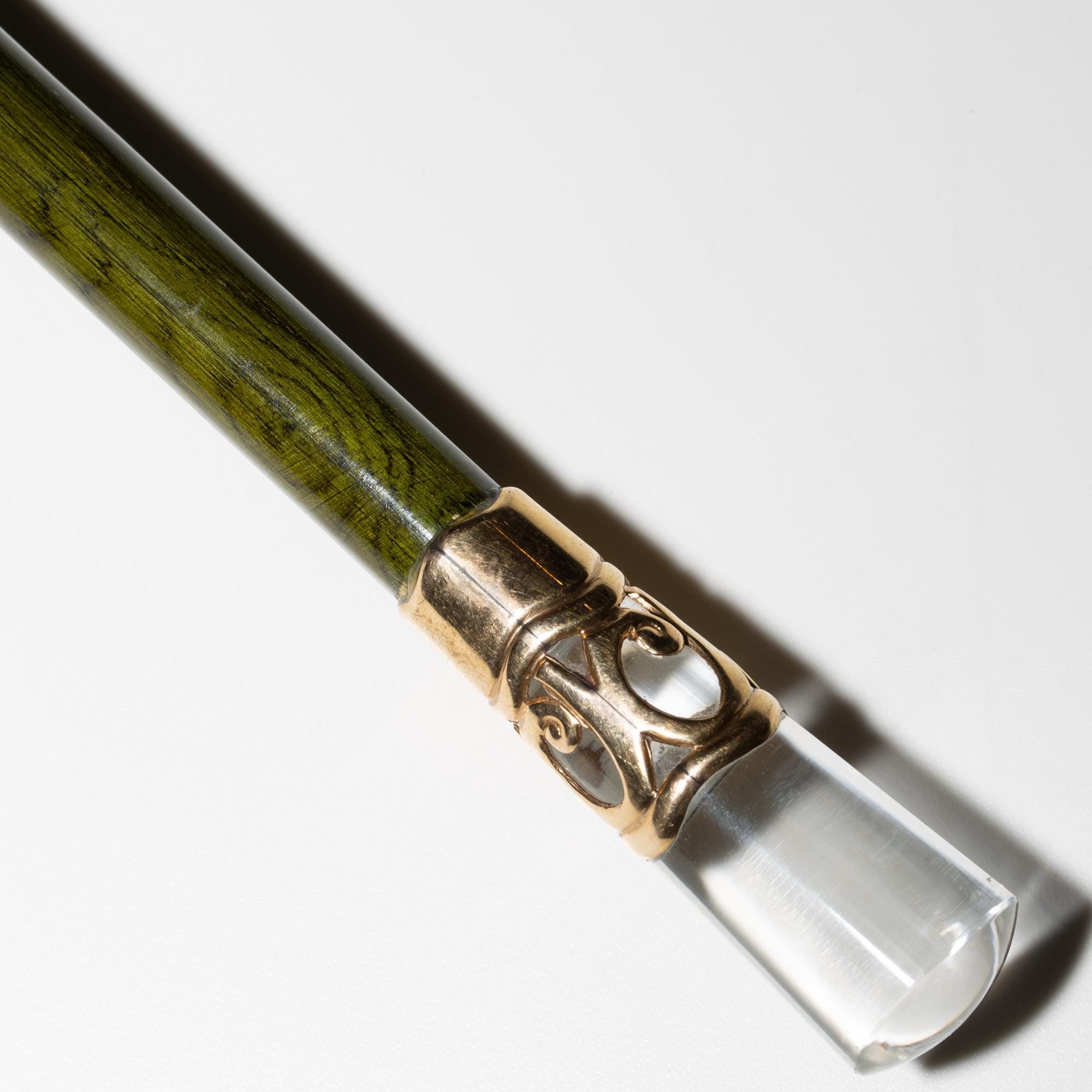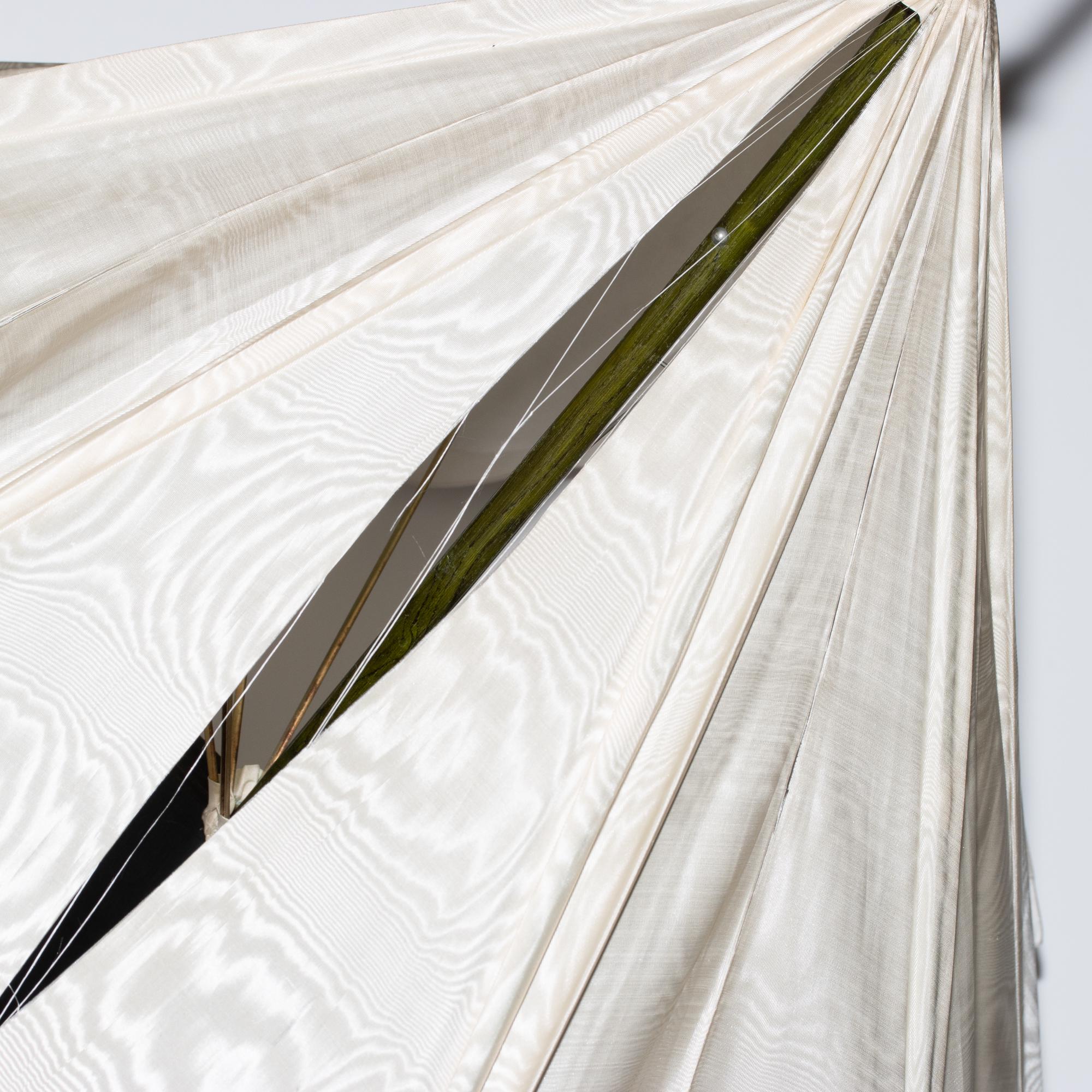 in used condition. Stained green wood handle with rolled gold decoration and glass finial, significant rip in silk – see photos.