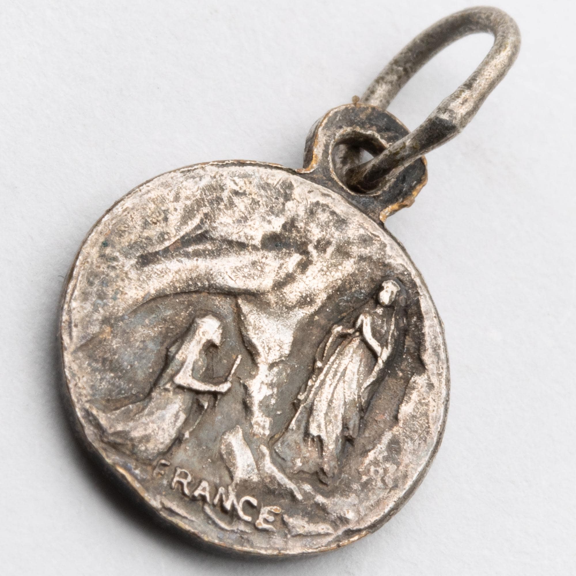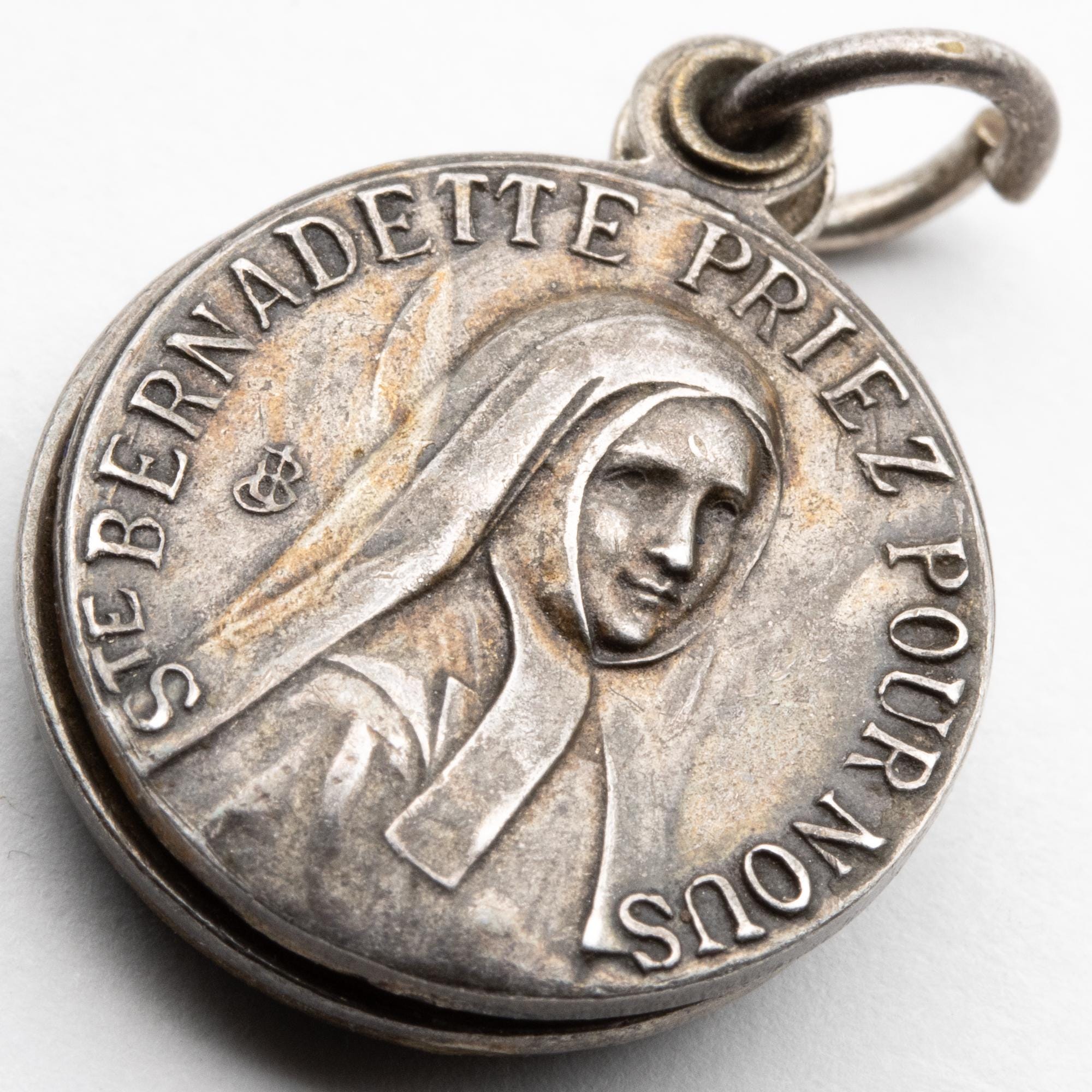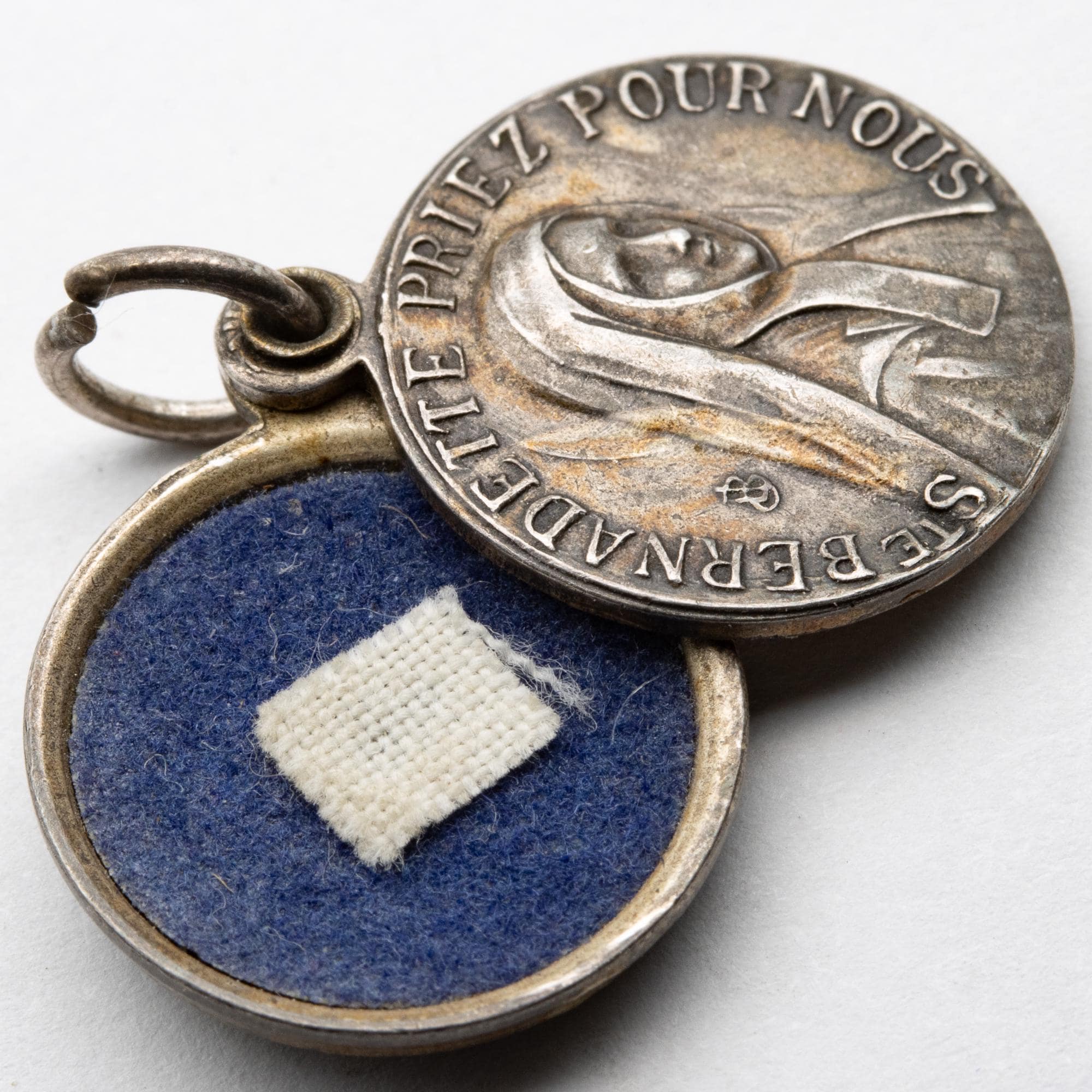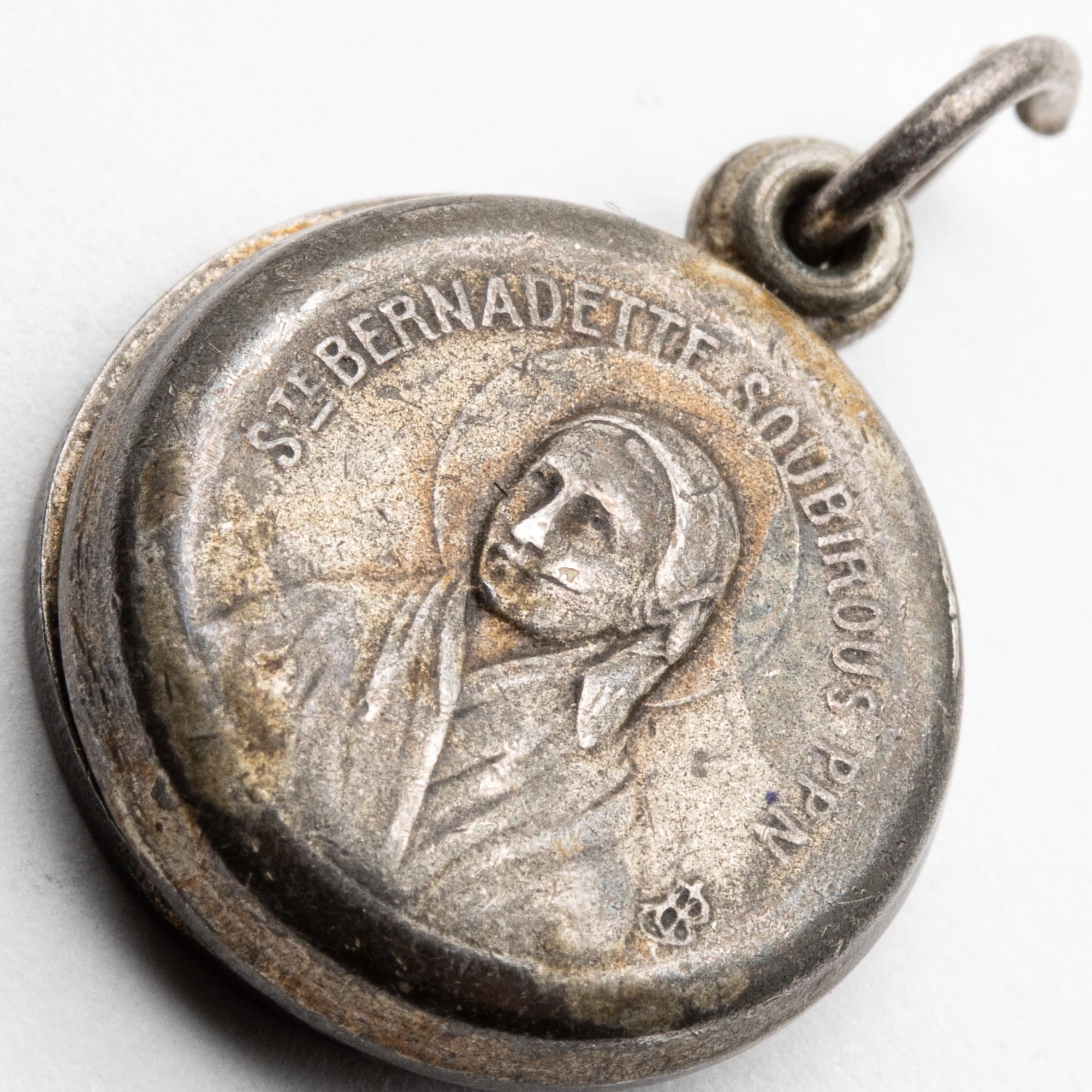 in good used condition. 2 enamel tokens, a silver token and a piece of fabric that has touched st Bernadette.