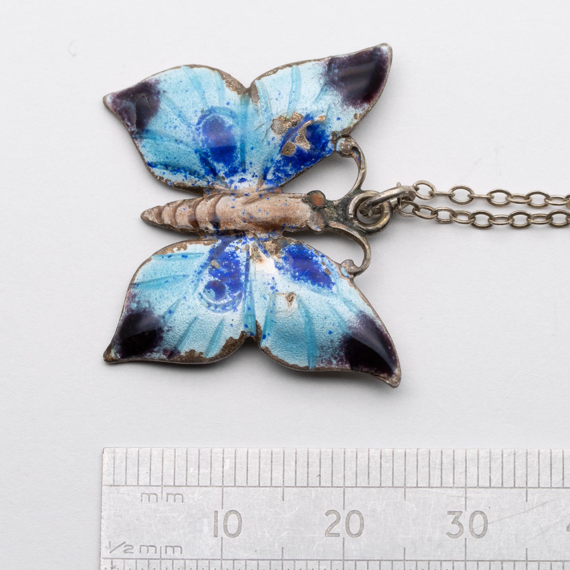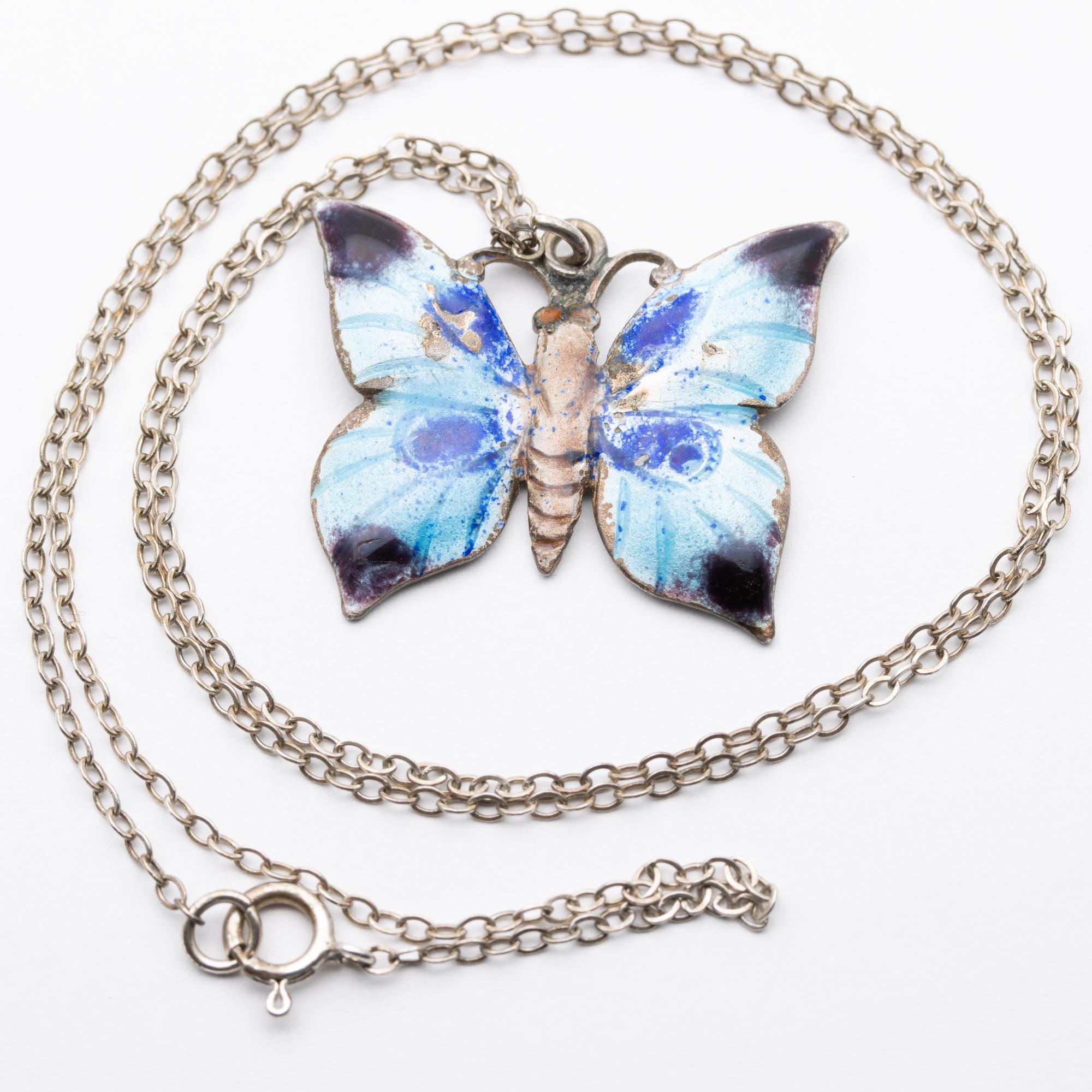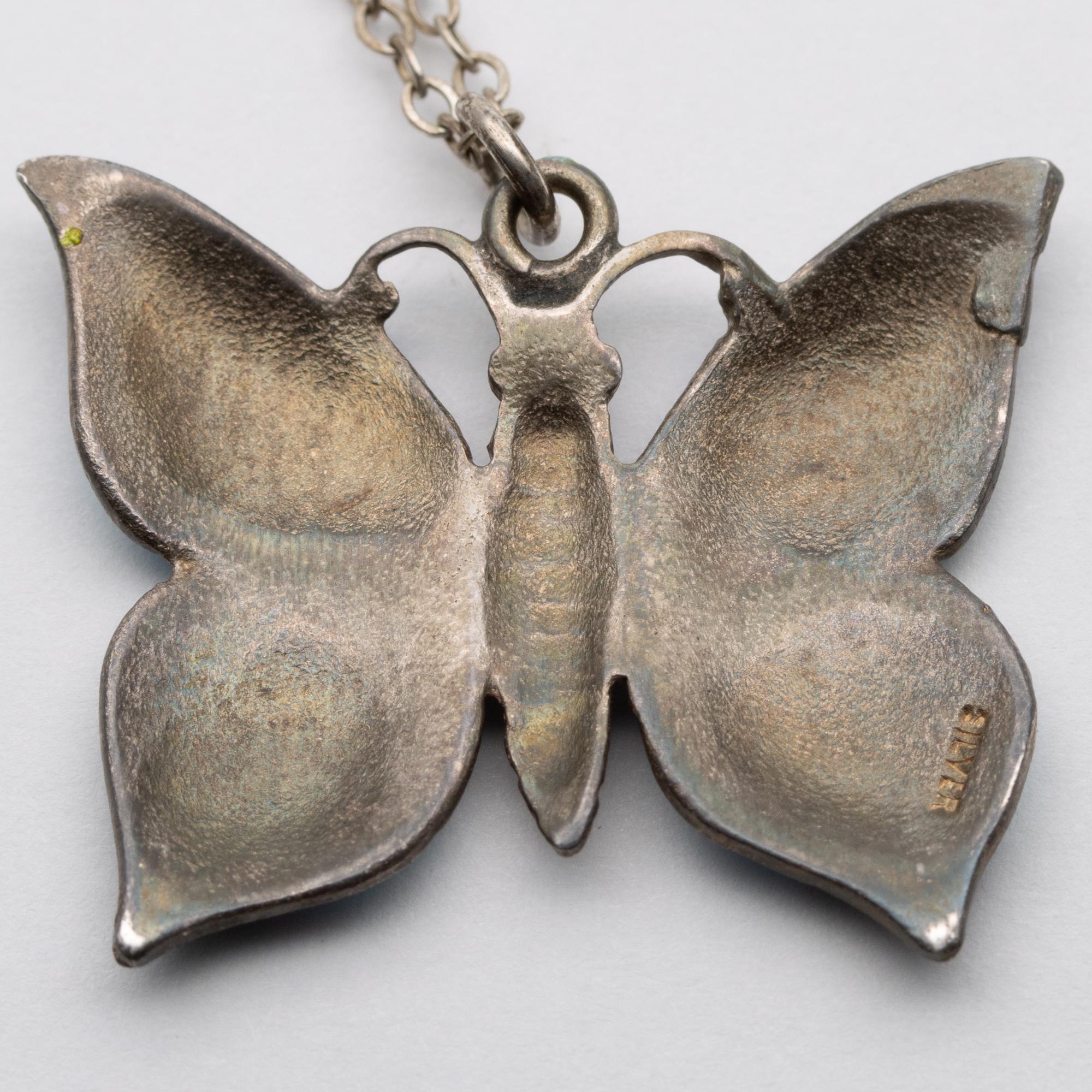 Sweet Vintage Sterling Silver Enamel Butterfly Pendant Necklace