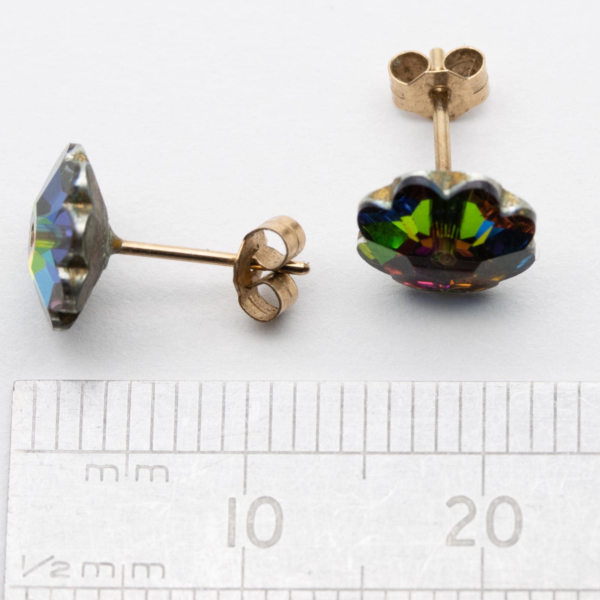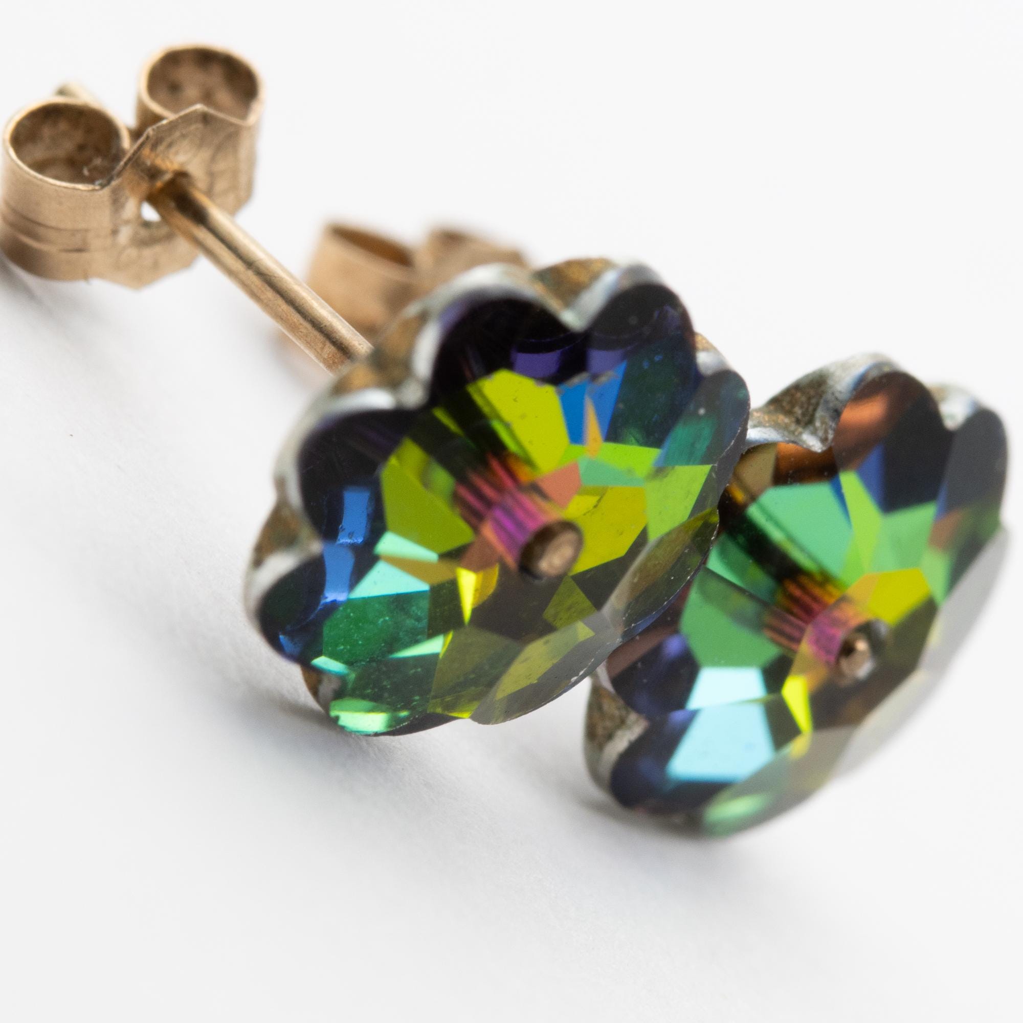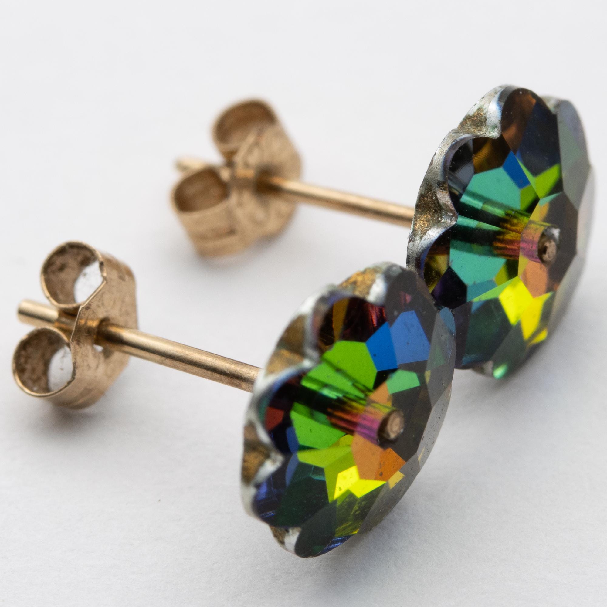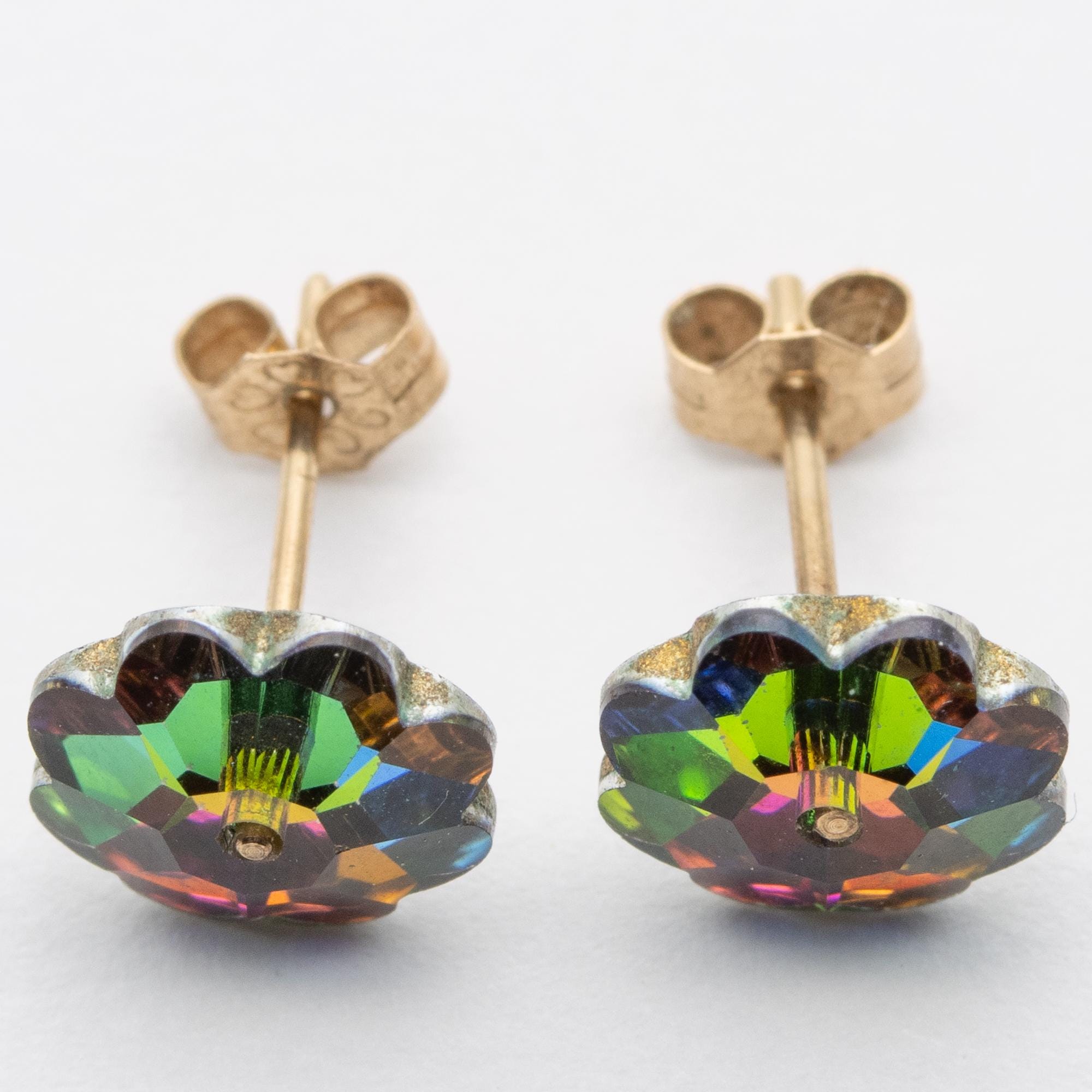 Pretty Vintage 9ct Yellow Gold Austrian Crystal Green & Pink Flower Stud Earrings